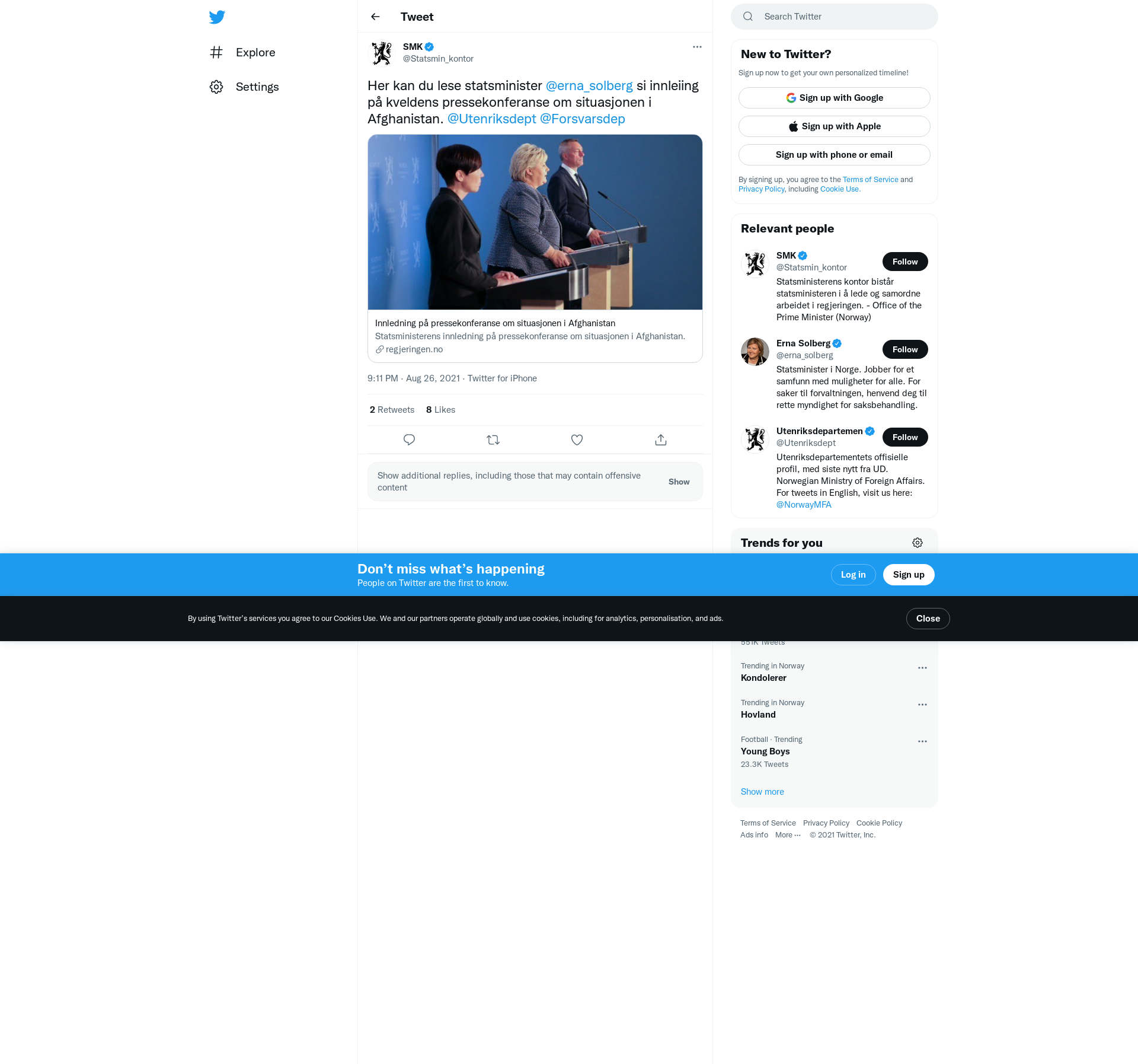 Her kan du lese statsminister @erna_solberg si innleiing på kveldens pressekonferanse om situasjonen i Afghanistan. @Utenriksdept @Forsvarsdep https://t.co/8qytPCFvBj