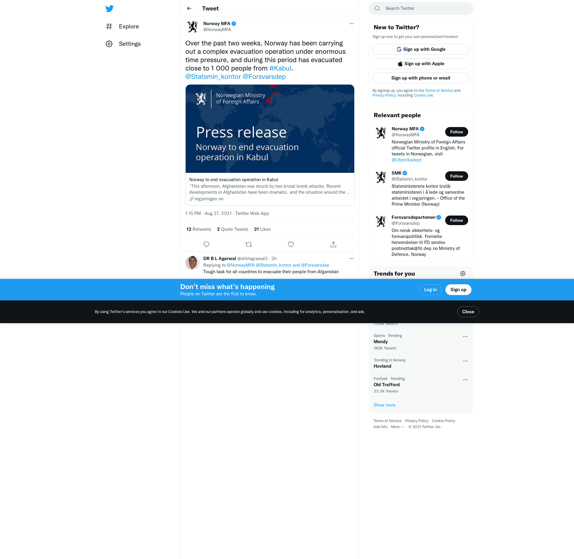 Over the past two weeks, Norway has been carrying out a complex evacuation operation under enormous time pressure, and during this period has evacuated close to 1 000 people from #Kabul.