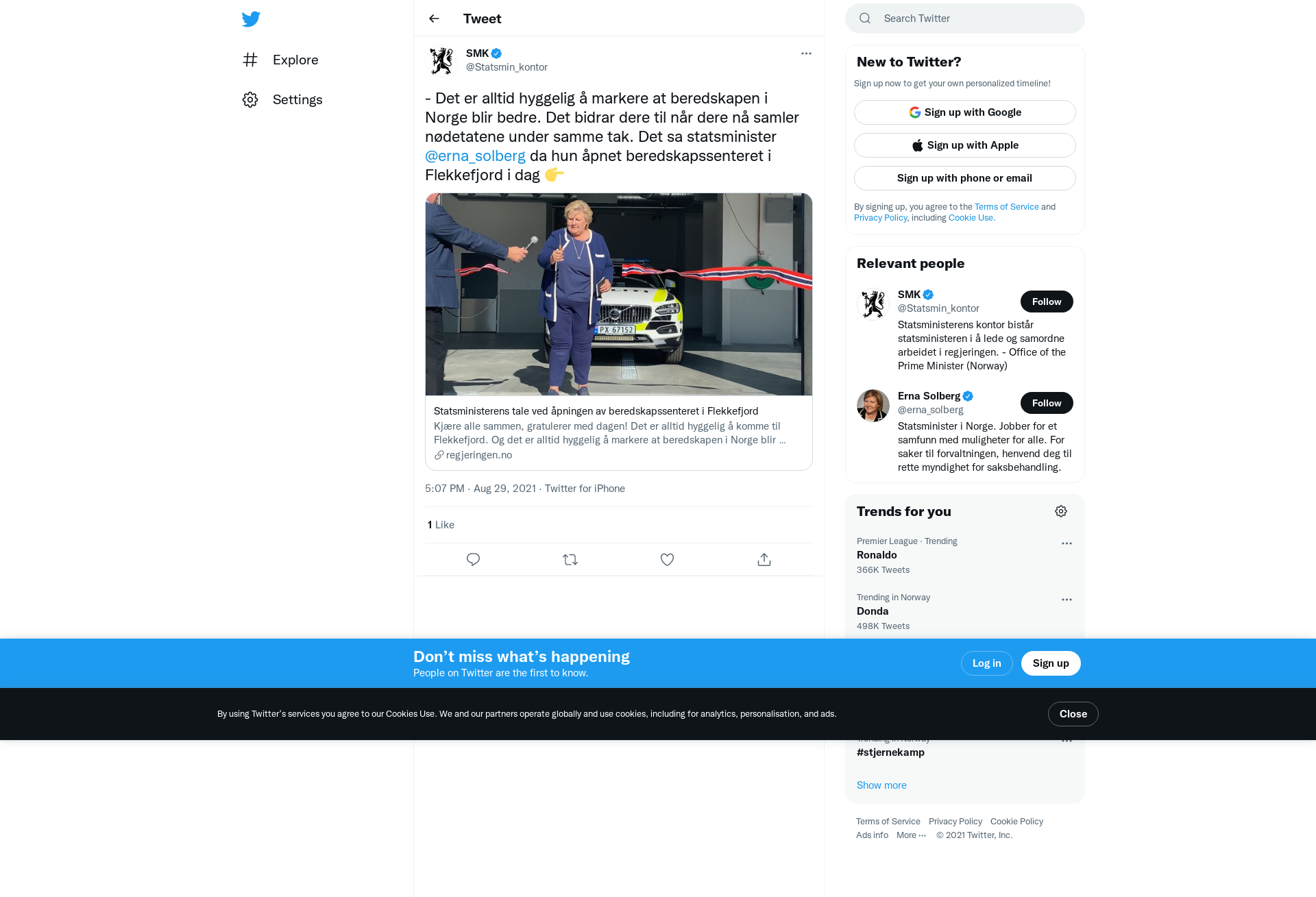 - Det er alltid hyggelig å markere at beredskapen i Norge blir bedre. Det bidrar dere til når dere nå samler nødetatene under samme tak. Det sa statsminister @erna_solberg da hun åpnet beredskapssenteret i Flekkefjord i dag 👉https://t.co/9PTb8ifg9W