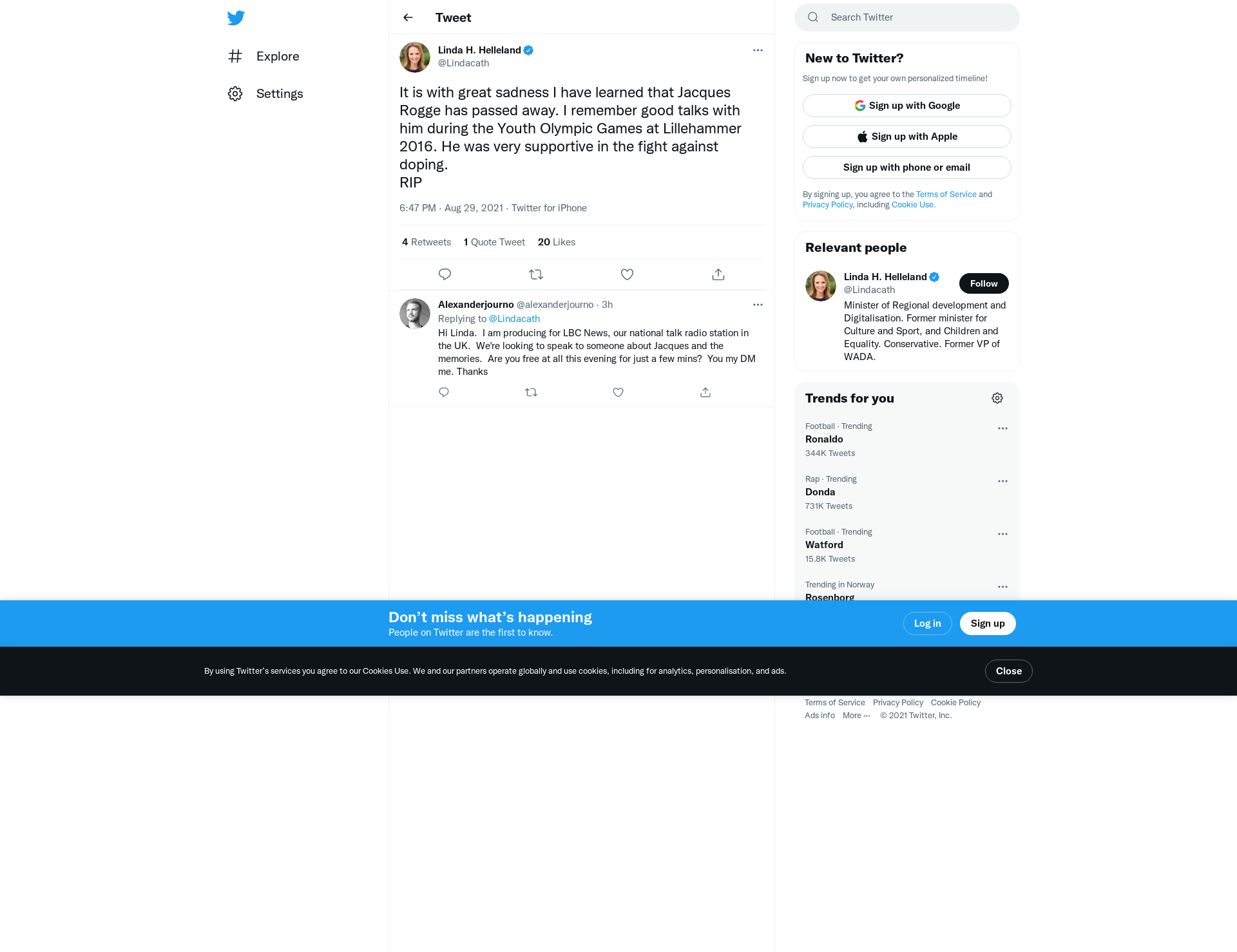It is with great sadness I have learned that Jacques Rogge has passed away. I remember good talks with him during the Youth Olympic Games at Lillehammer 2016. He was very supportive in the fight against doping.