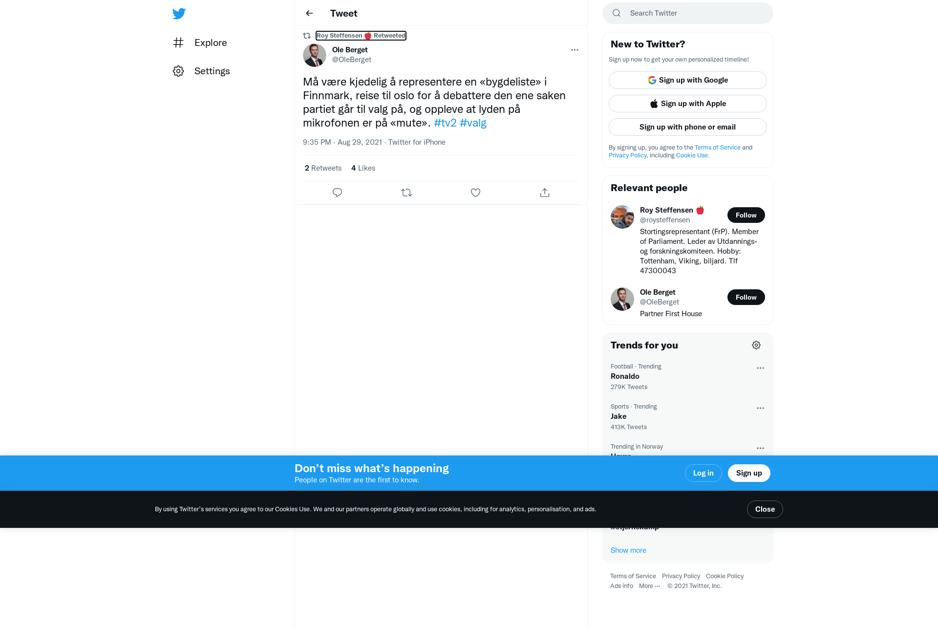 RT @OleBerget: Må være kjedelig å representere en «bygdeliste» i Finnmark, reise til oslo for å debattere den ene saken partiet går til valg på, og oppleve at lyden på mikrofonen er på «mute». #tv2 #valg