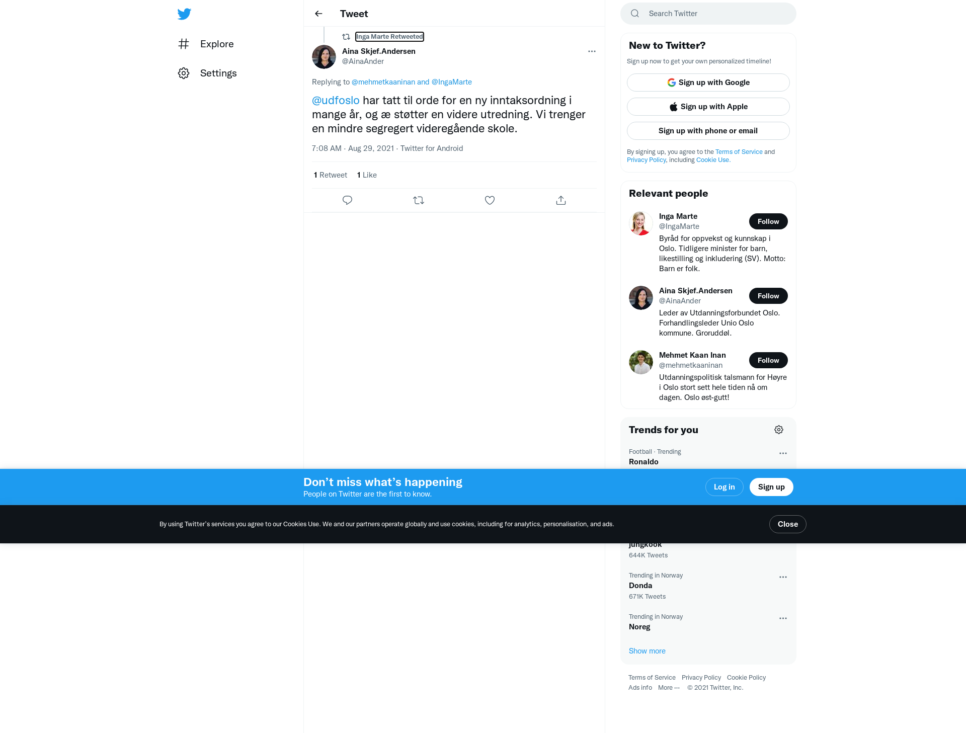 RT @AinaAnder: @mehmetkaaninan @IngaMarte @udfoslo har tatt til orde for en ny inntaksordning i mange år, og æ støtter en videre utredning. Vi trenger en mindre segregert videregående skole.