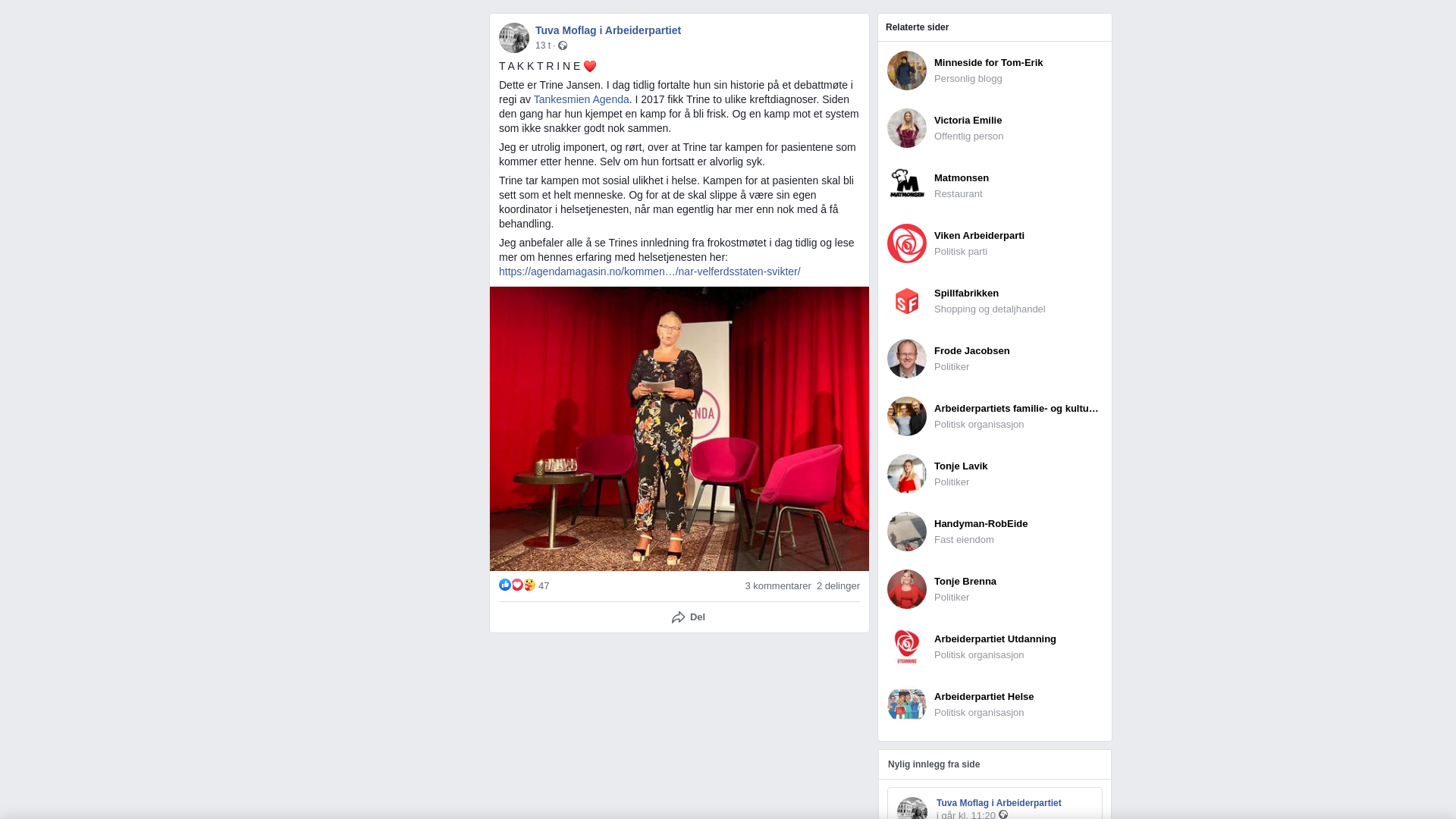 Jeg anbefaler alle å se Trines innledning fra frokostmøtet i dag tidlig og lese mer om hennes erfaring med helsetjenesten her: https://agendamagasin.no/kommentarer/nar-velferdsstaten-svikter/