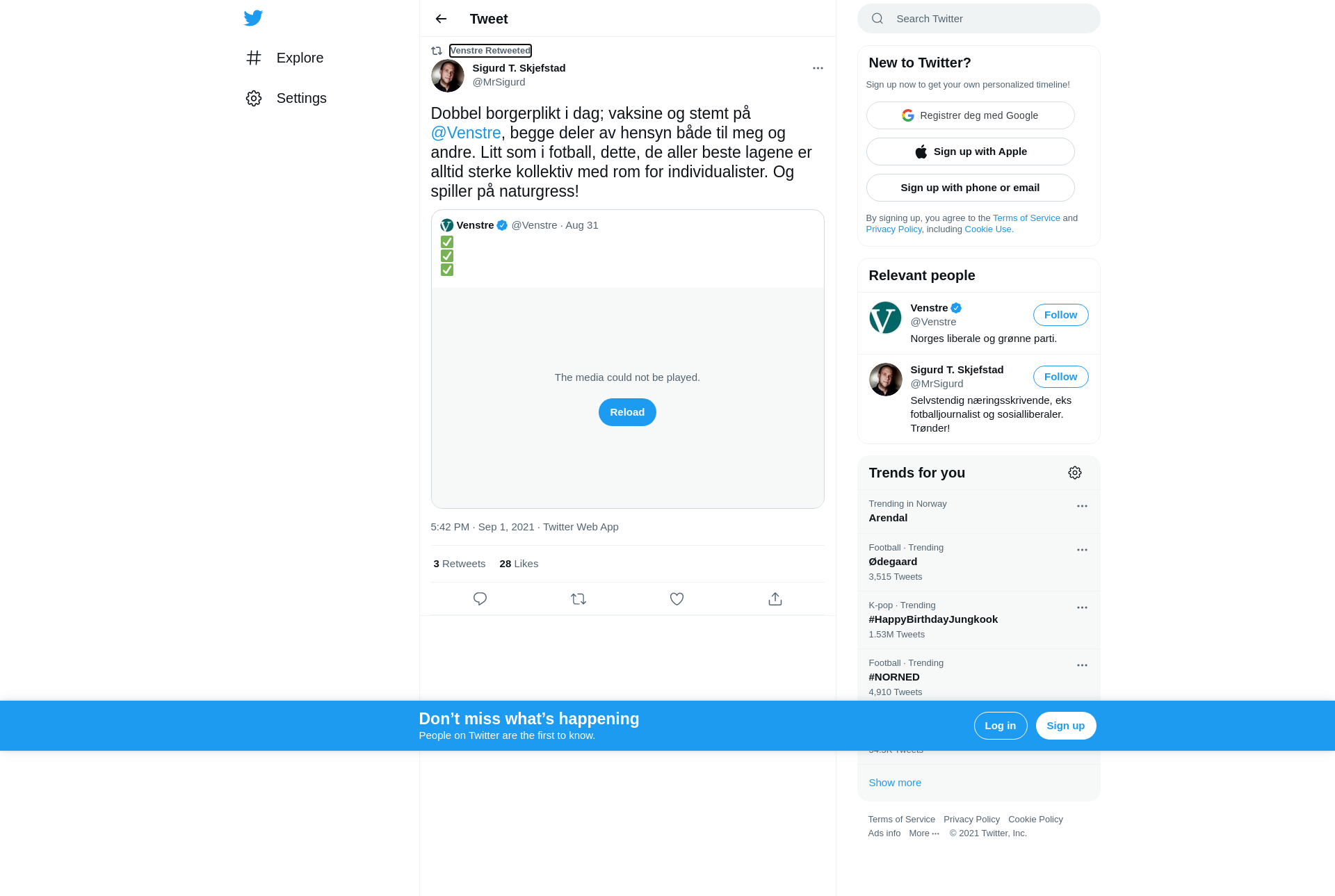 RT @MrSigurd: Dobbel borgerplikt i dag; vaksine og stemt på @Venstre, begge deler av hensyn både til meg og andre. Litt som i fotball, dette, de aller beste lagene er alltid sterke kollektiv med rom for individualister. Og spiller på naturgress!