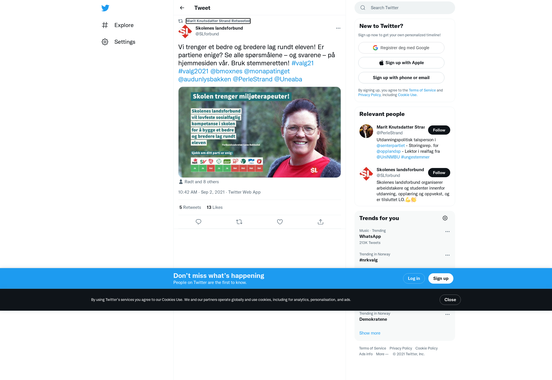 RT @SLforbund: Vi trenger et bedre og bredere lag rundt eleven! Er partiene enige? Se alle spørsmålene – og svarene – på hjemmesiden vår. Bruk stemmeretten! #valg21 #valg2021 @bmoxnes @monapatinget @audunlysbakken @PerleStrand @Uneaba https://t.co/h7wjRPNxO8