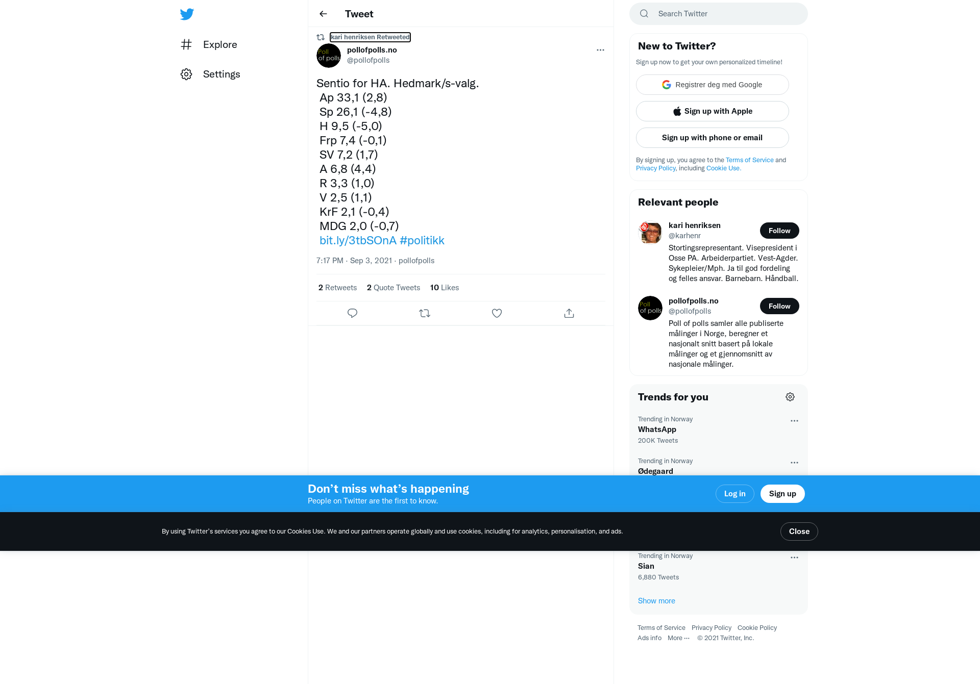 RT @pollofpolls: Sentio for HA. Hedmark/s-valg. Ap 33,1 (2,8) Sp 26,1 (-4,8) H 9,5 (-5,0) Frp 7,4 (-0,1) SV 7,2 (1,7) A 6,8 (4,4) R…