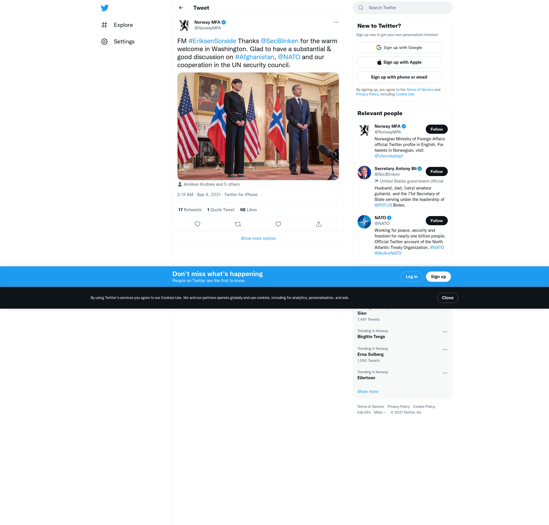 FM #EriksenSoreide Thanks @SecBlinken for the warm welcome in Washington. Glad to have a substantial & good discussion on #Afghanistan, @NATO and our cooperation in the UN security council. https://t.co/laDT6ZwntW
