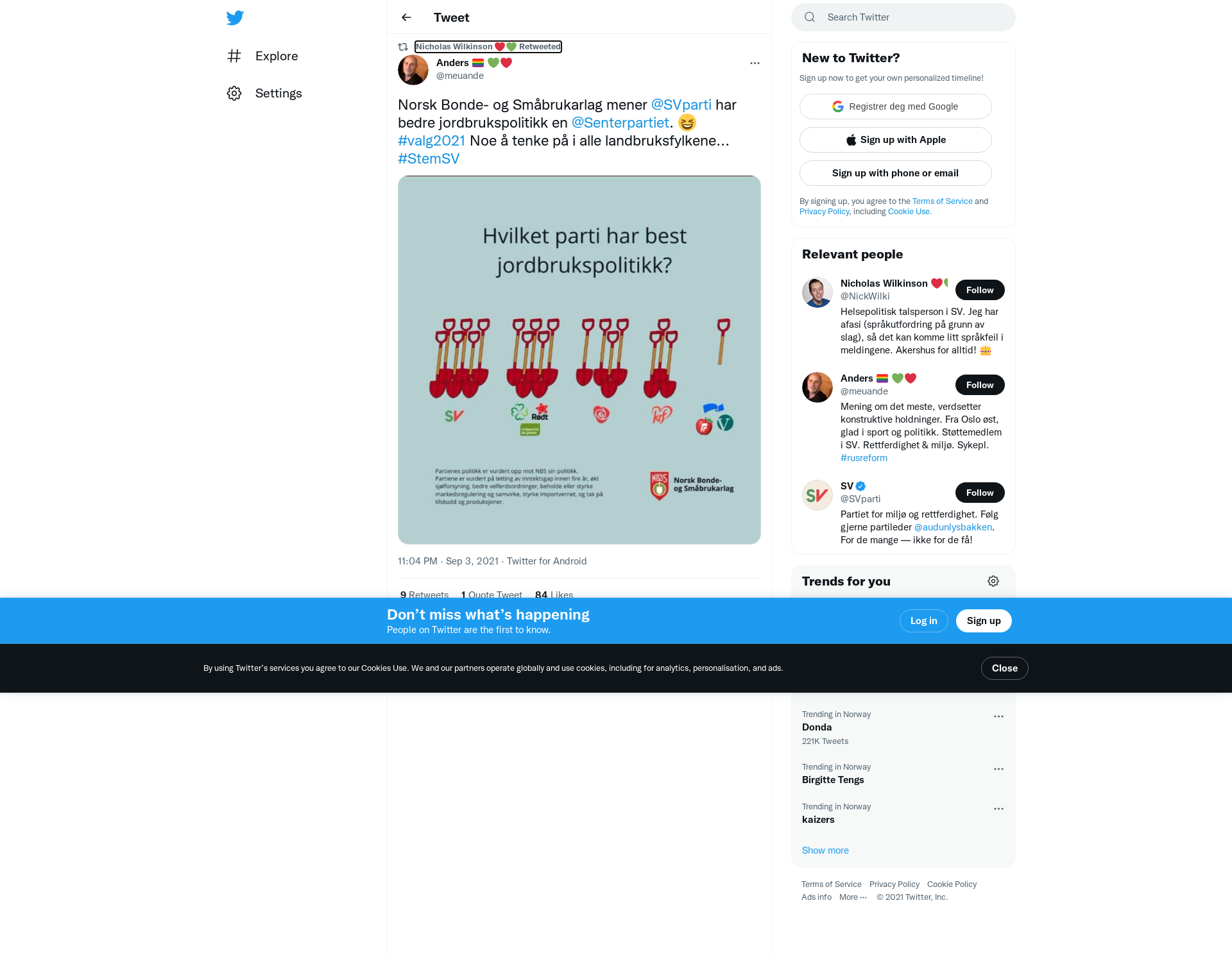 RT @meuande: Norsk Bonde- og Småbrukarlag mener @SVparti har bedre jordbrukspolitikk en @Senterpartiet. 😆 #valg2021 Noe å tenke på i alle landbruksfylkene... #StemSV https://t.co/HKmejWUrW2