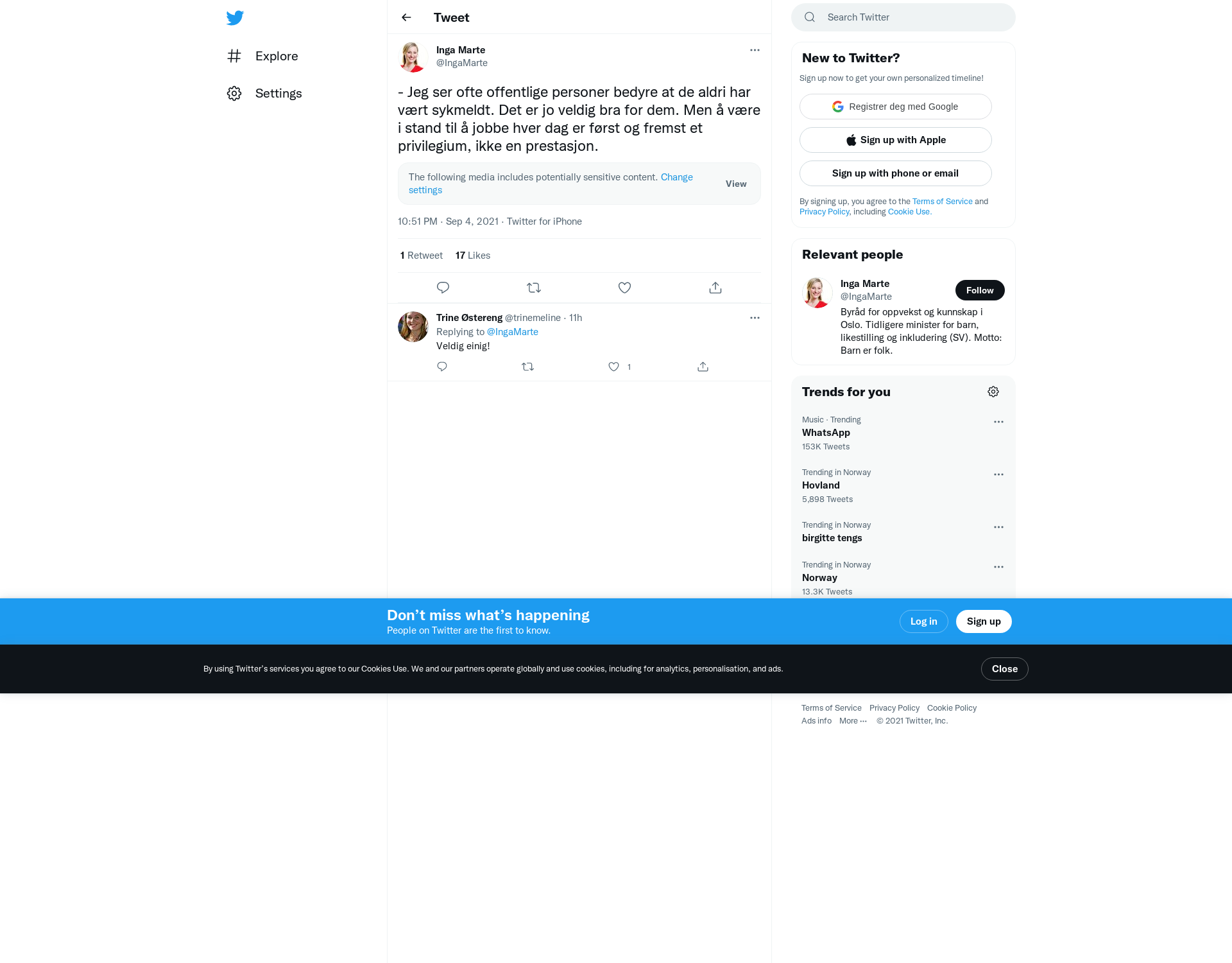 - Jeg ser ofte offentlige personer bedyre at de aldri har vært sykmeldt. Det er jo veldig bra for dem. Men å være i stand til å jobbe hver dag er først og fremst et privilegium, ikke en prestasjon. https://t.co/OLs0F8gOfC