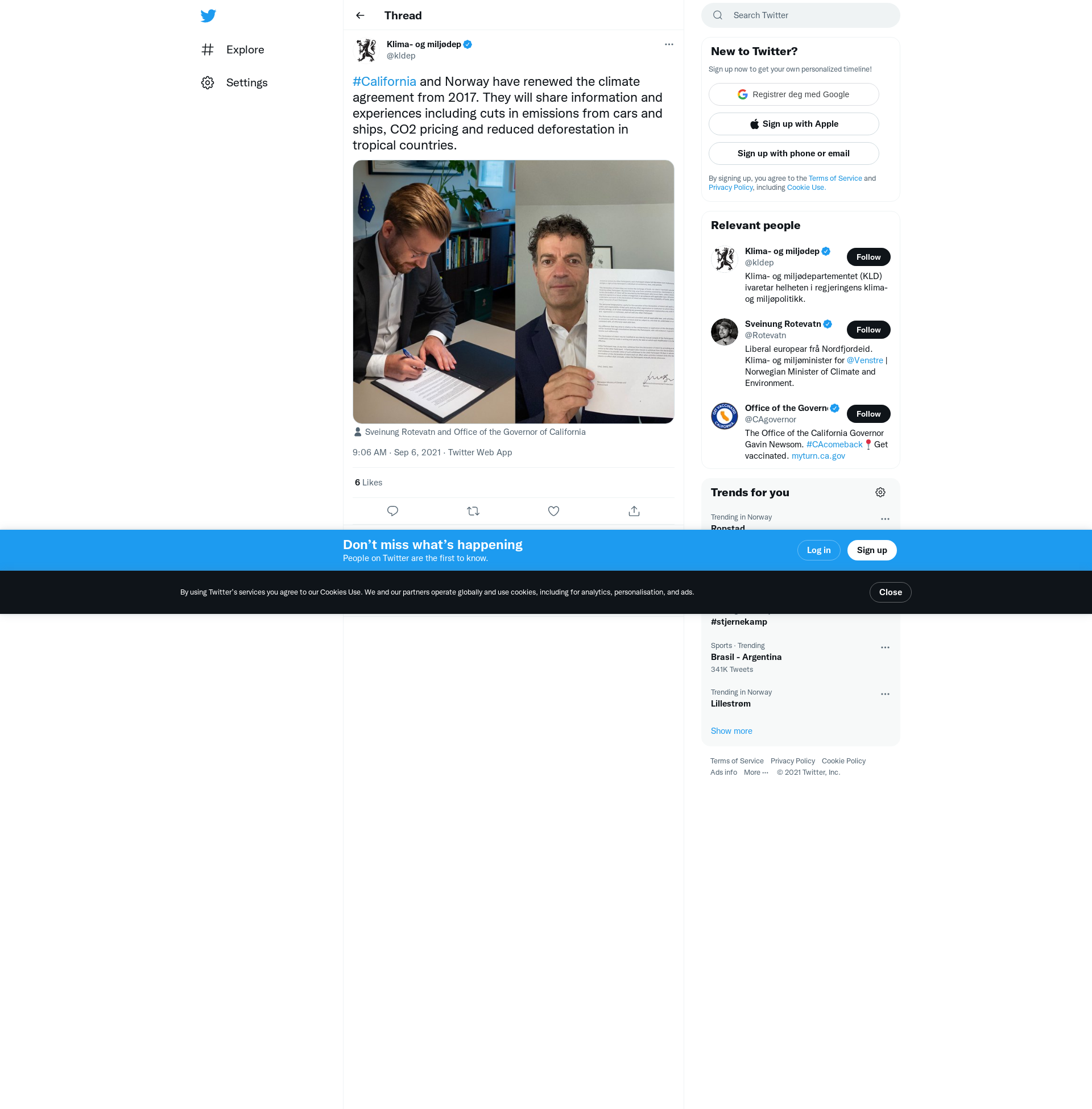 #California and Norway have renewed the climate agreement from 2017. They will share information and experiences including cuts in emissions from cars and ships, CO2 pricing and reduced deforestation in tropical countries. https://t.co/IBJOJOVshx