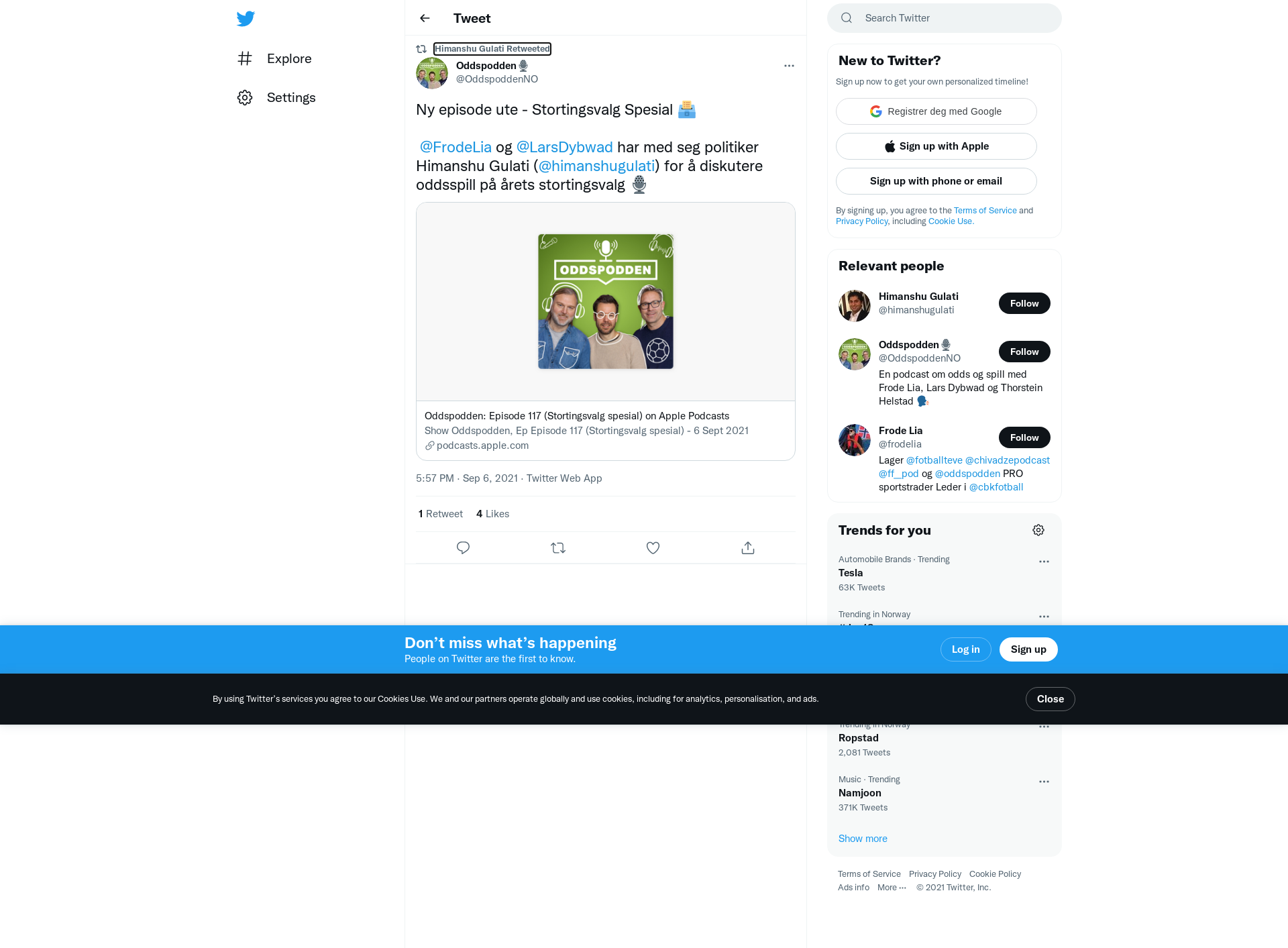 RT @OddspoddenNO: Ny episode ute - Stortingsvalg Spesial 🗳️ @FrodeLia og @LarsDybwad har med seg politiker Himanshu Gulati (@himanshugula…