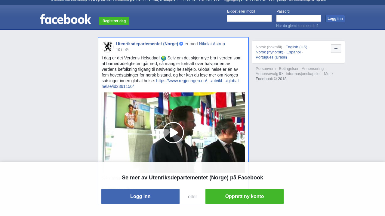 I dag er det Verdens Helsedag! 🌎 Selv om det skjer mye bra i verden som at barnedødeligheten går ned, så mangler fortsatt over halvparten av verdens befolkning tilgang til nødvendig helsehjelp. Global helse er én av fem hovedsatsinger for norsk bistand, og her kan du lese mer om Norges satsinger innen global helse: https://www.regjeringen.no/no/tema/utenrikssaker/utviklingssamarbeid/global-helse/id2361150/