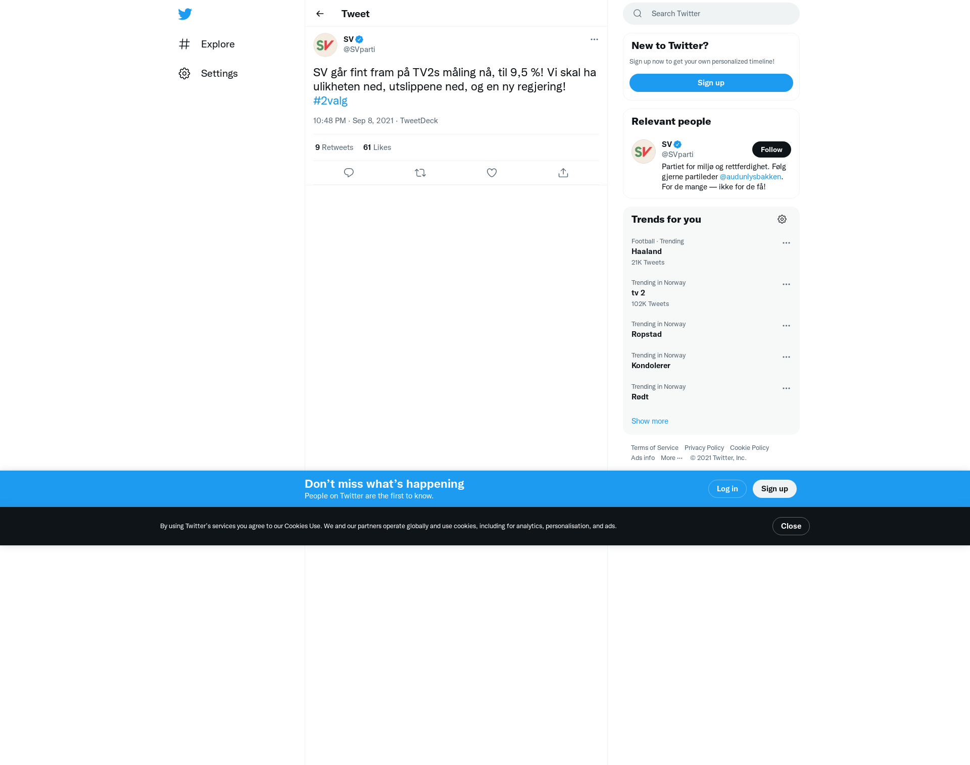 SV går fint fram på TV2s måling nå, til 9,5 %! Vi skal ha ulikheten ned, utslippene ned, og en ny regjering! #2valg
