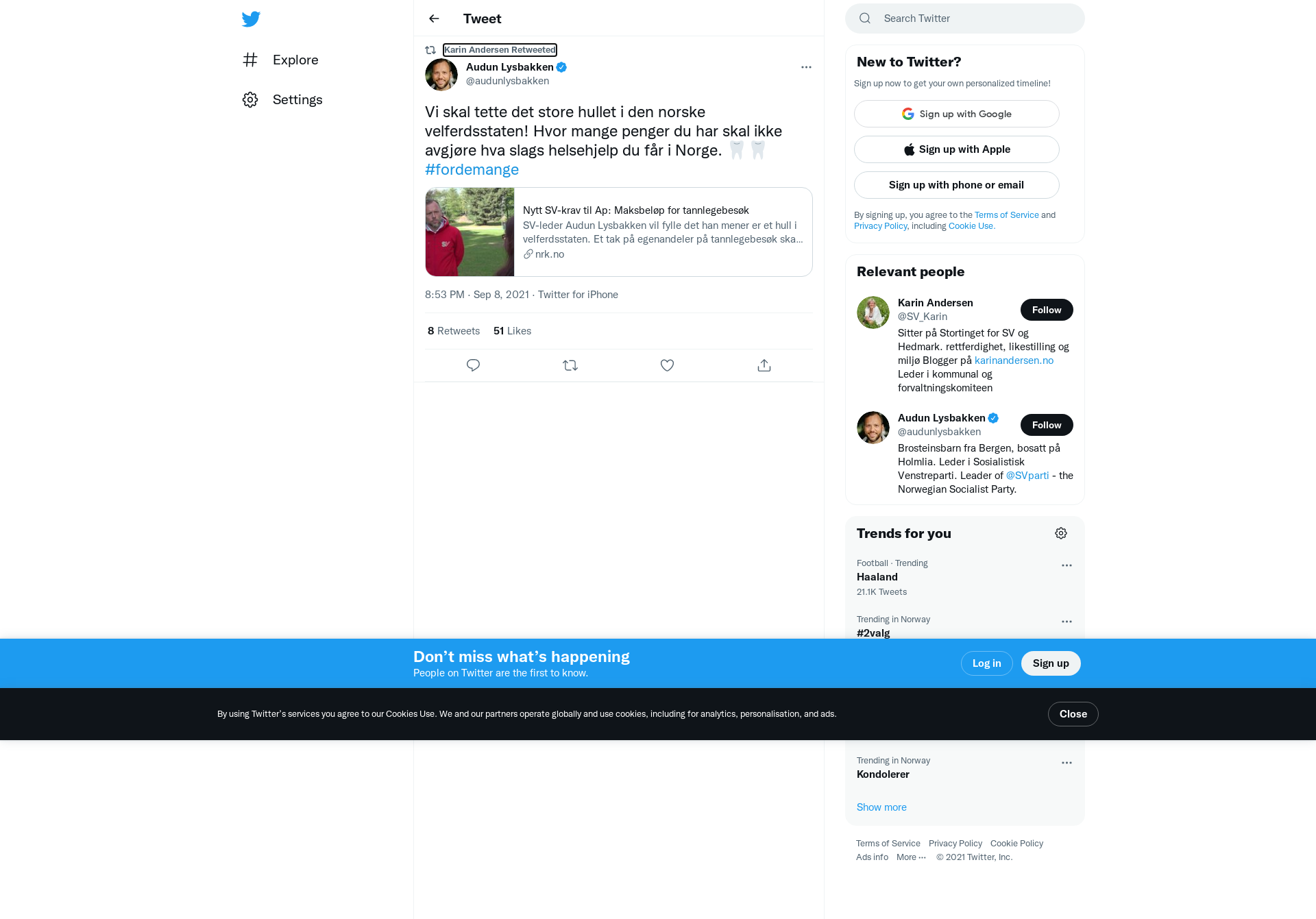 RT @audunlysbakken: Vi skal tette det store hullet i den norske velferdsstaten! Hvor mange penger du har skal ikke avgjøre hva slags helsehjelp du får i Norge. 🦷🦷 #fordemange https://t.co/c2U1s3wwmG