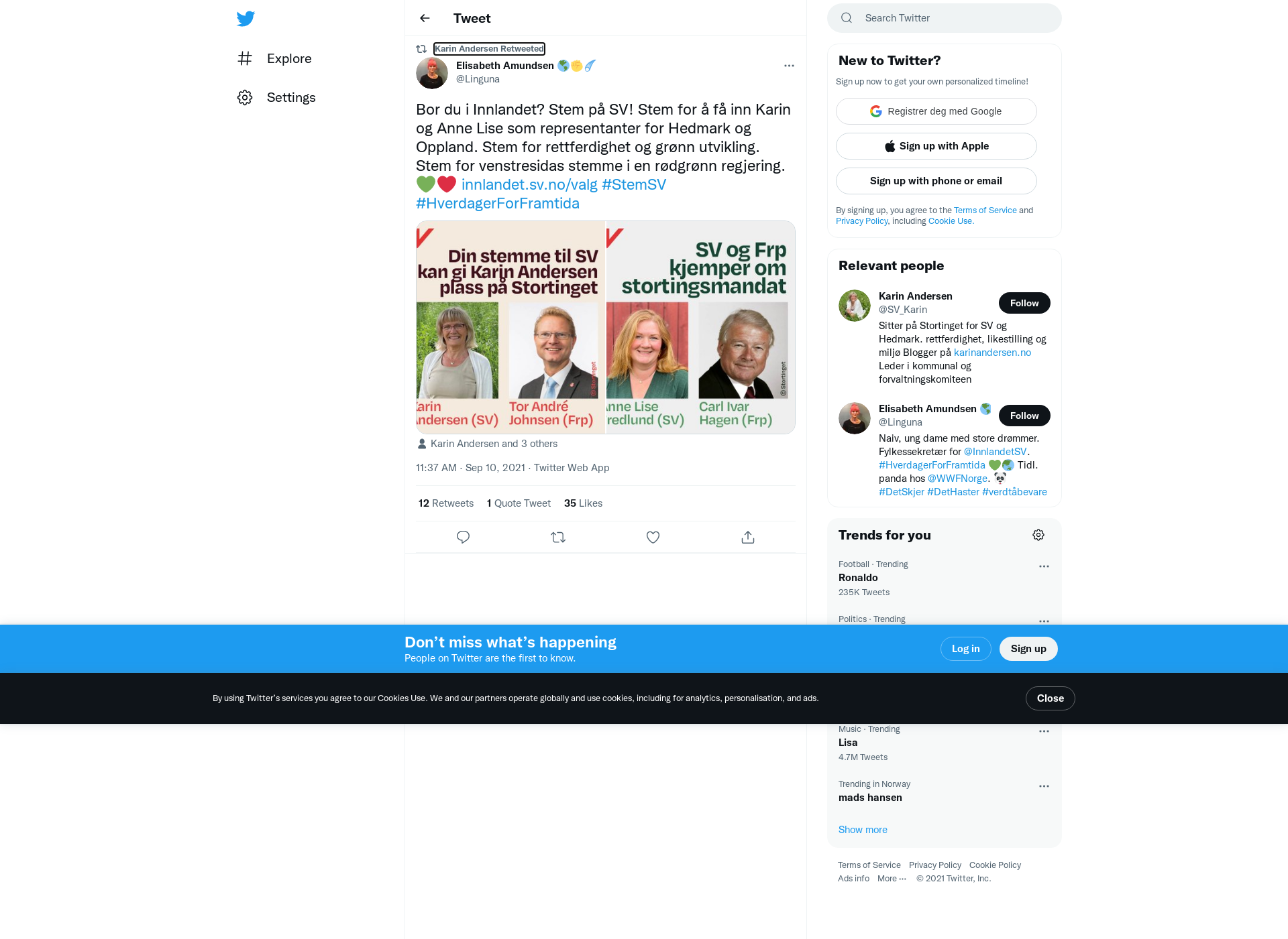 RT @Linguna: Bor du i Innlandet? Stem på SV! Stem for å få inn Karin og Anne Lise som representanter for Hedmark og Oppland. Stem for rettferdighet og grønn utvikling. Stem for venstresidas stemme i en rødgrønn regjering. 💚❤️ https://t.co/TWrNOP65D0 #StemSV #HverdagerForFramtida https://t.co/ehjyNfp23V