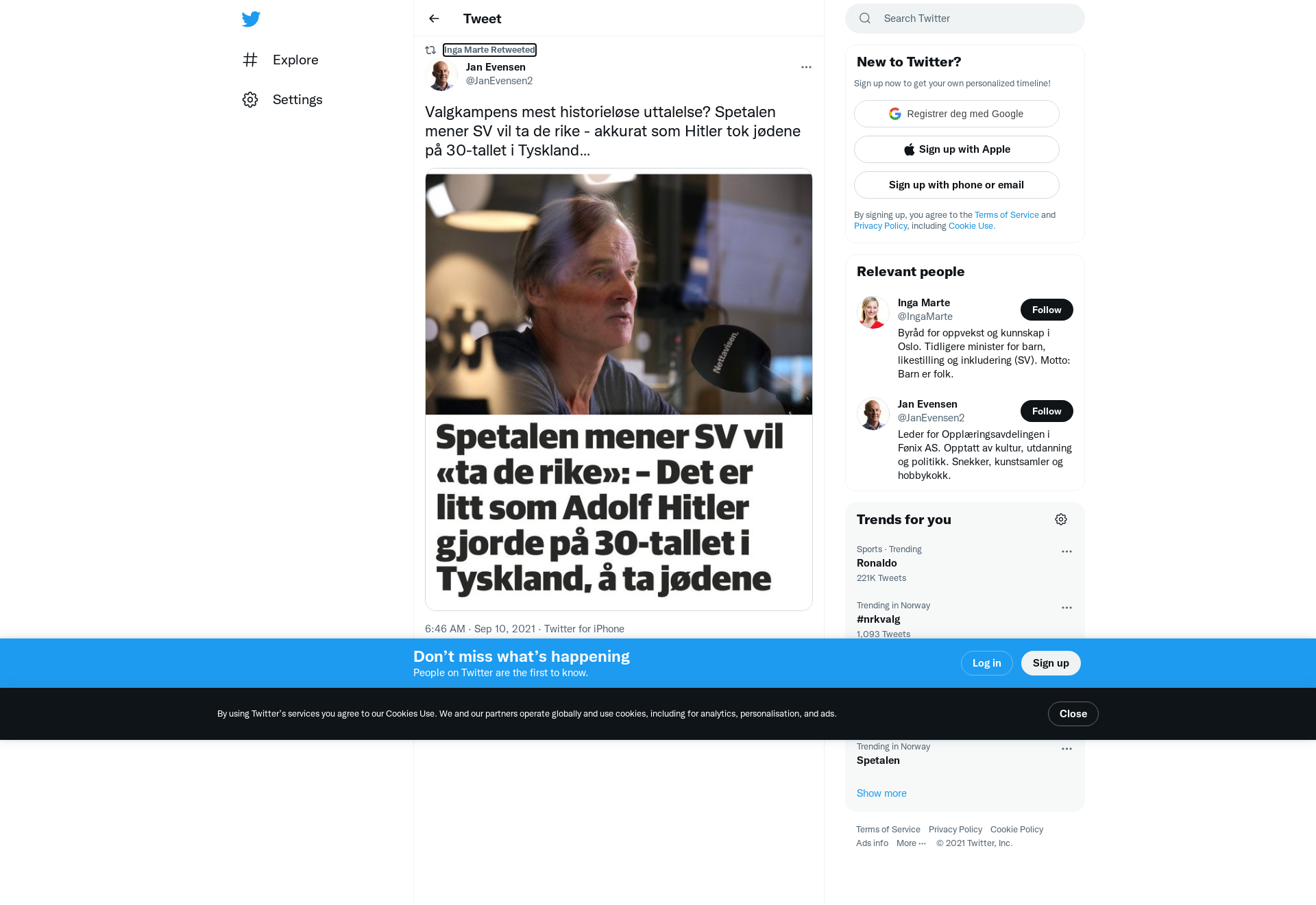RT @JanEvensen2: Valgkampens mest historieløse uttalelse? Spetalen mener SV vil ta de rike - akkurat som Hitler tok jødene på 30-tallet i Tyskland… https://t.co/GDMG00JE3t