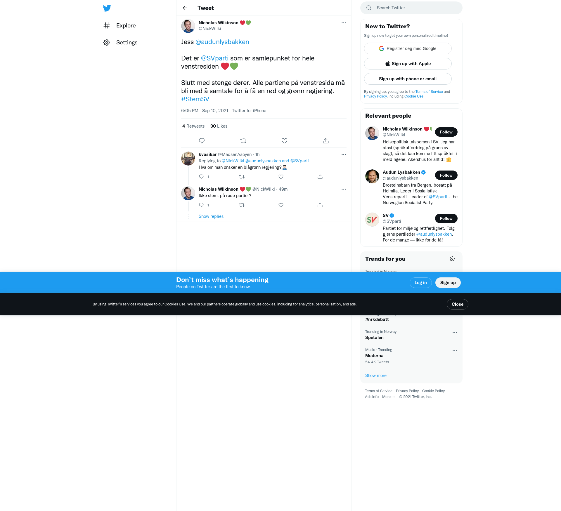 Jess @audunlysbakken Det er @SVparti som er samlepunket for hele venstresiden ❤️💚 Slutt med stenge dører. Alle partiene på venstresida må bli med å samtale for å få en rød og grønn regjering. #StemSV