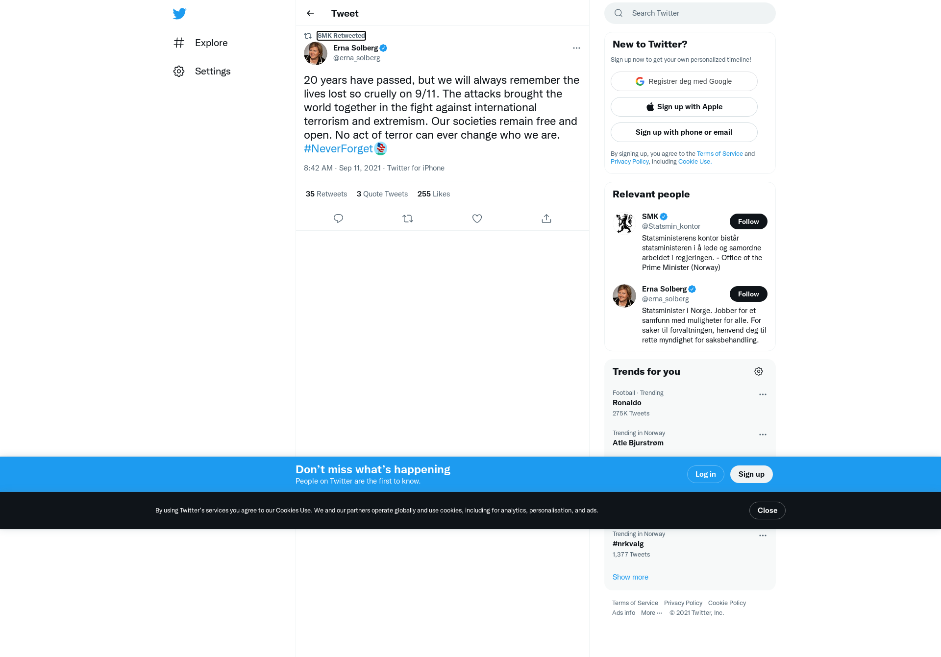 RT @erna_solberg: 20 years have passed, but we will always remember the lives lost so cruelly on 9/11. The attacks brought the world together in the fight against international terrorism and extremism. Our societies remain free and open. No act of terror can ever change who we are. #NeverForget