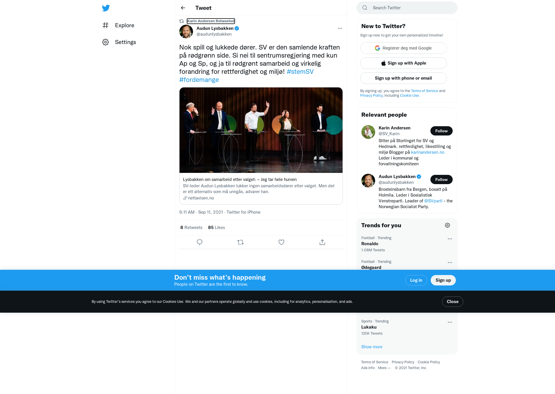 RT @audunlysbakken: Nok spill og lukkede dører. SV er den samlende kraften på rødgrønn side. Si nei til sentrumsregjering med kun Ap og Sp, og ja til rødgrønt samarbeid og virkelig forandring for rettferdighet og miljø! #stemSV #fordemange https://t.co/rg500cWVDz