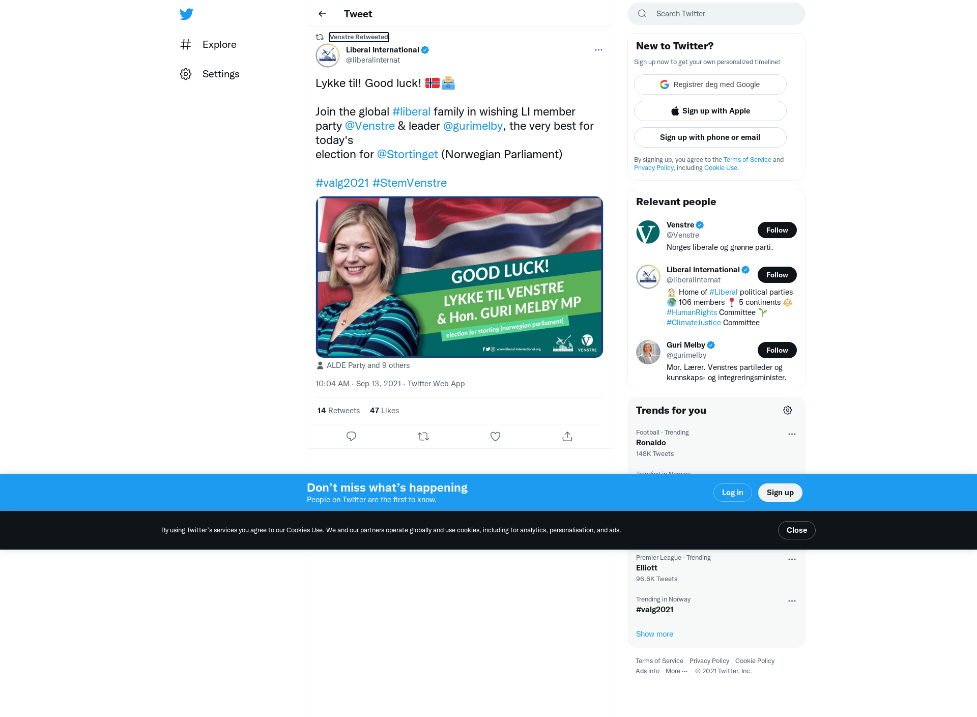 RT @liberalinternat: Lykke til! Good luck! 🇳🇴🗳 Join the global #liberal family in wishing LI member party @Venstre & leader @gurimelby, th…