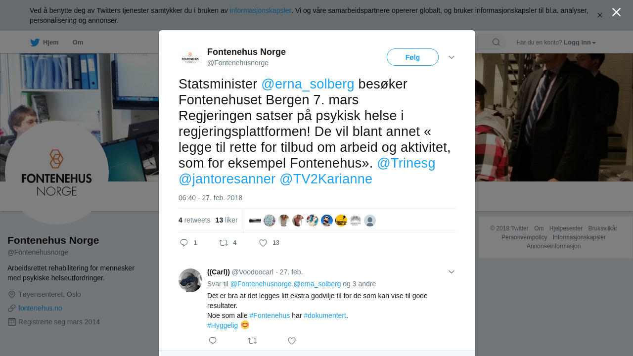RT @Fontenehusnorge: Statsminister @erna_solberg besøker Fontenehuset Bergen 7. mars Regjeringen satser på psykisk helse i regjeringsplattf…