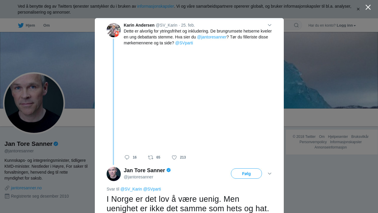 @SV_Karin @SVparti I Norge er det lov å være uenig. Men uenighet er ikke det samme som hets og hat. Alle som nå prø… https://t.co/7FwhMTM8Q8