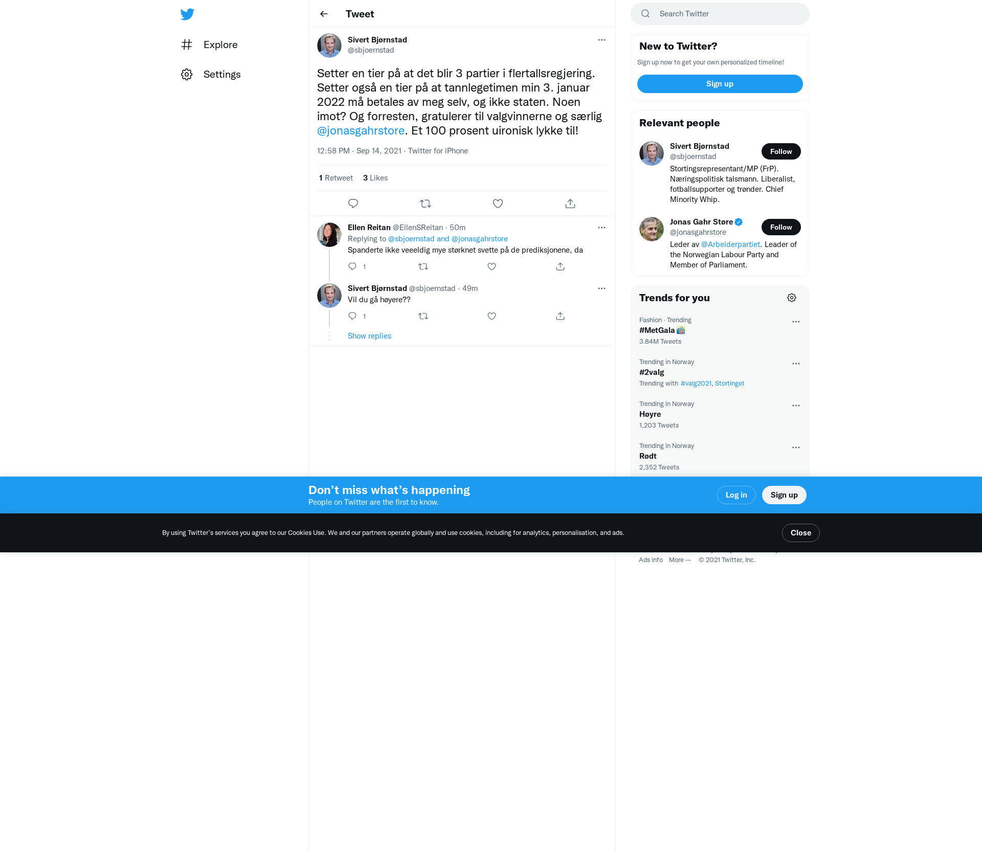 Setter en tier på at det blir 3 partier i flertallsregjering. Setter også en tier på at tannlegetimen min 3. januar 2022 må betales av meg selv, og ikke staten. Noen imot? Og forresten, gratulerer til valgvinnerne og særlig @jonasgahrstore. Et 100 prosent uironisk lykke til!