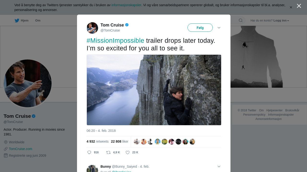 RT @TomCruise: #MissionImpossible trailer drops later today. I’m so excited for you all to see it. https://t.co/TqgW4BtiTf