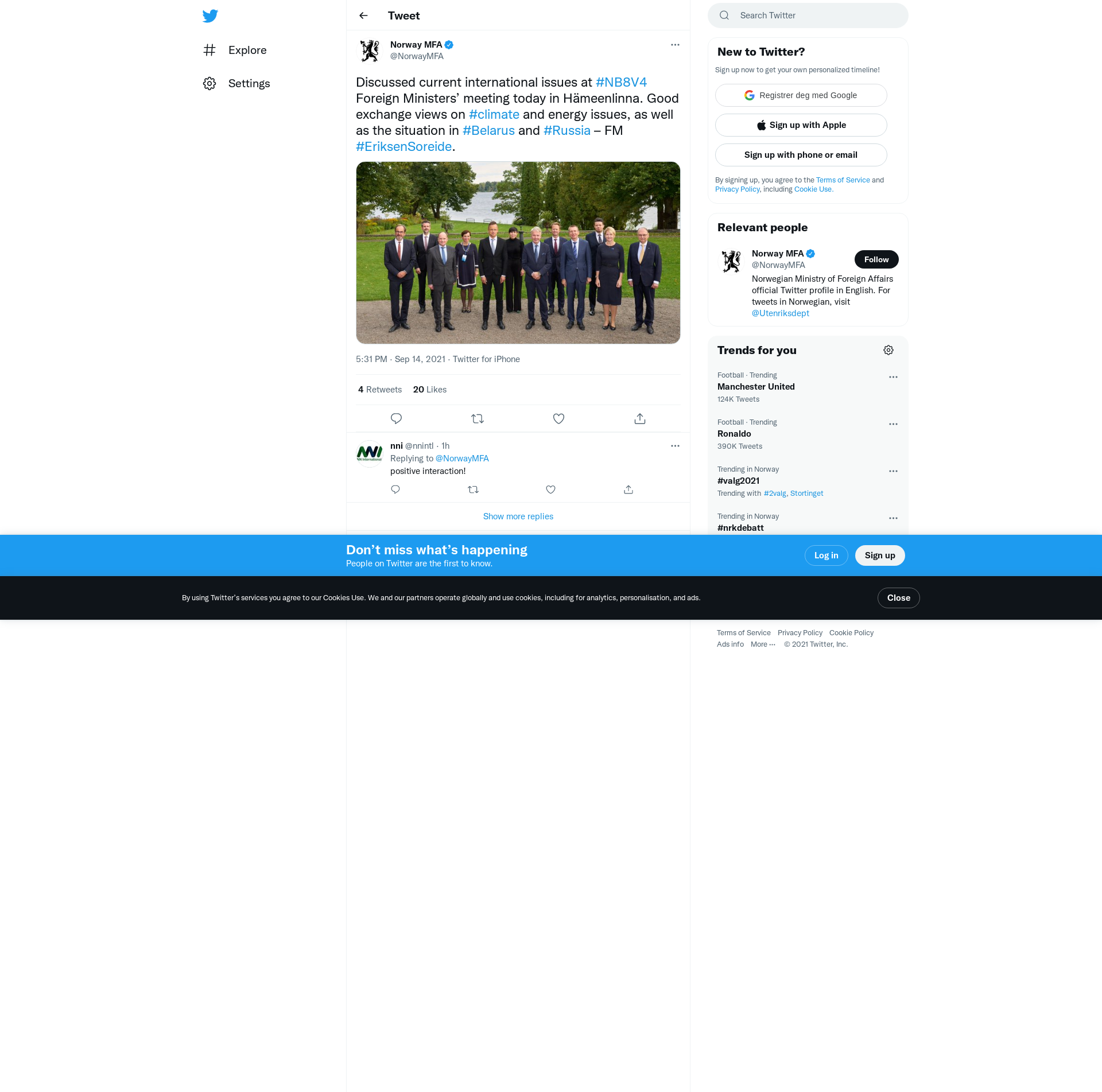 Discussed current international issues at #NB8V4 Foreign Ministers’ meeting today in Hämeenlinna. Good exchange views on #climate and energy issues, as well as the situation in #Belarus and #Russia – FM #EriksenSoreide. https://t.co/qurTltne70