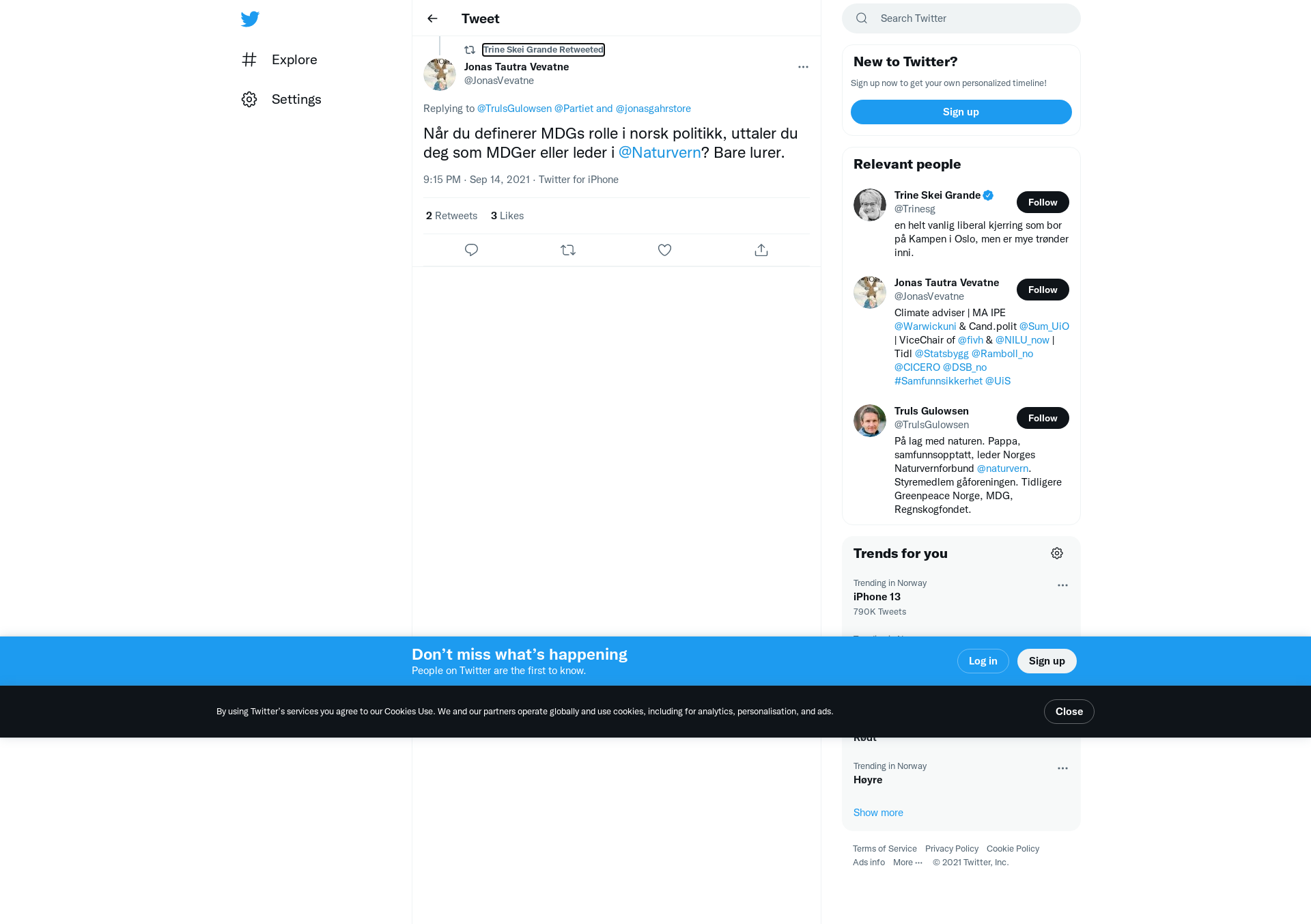 RT @JonasVevatne: @TrulsGulowsen @Partiet @jonasgahrstore Når du definerer MDGs rolle i norsk politikk, uttaler du deg som MDGer eller leder i @Naturvern? Bare lurer.