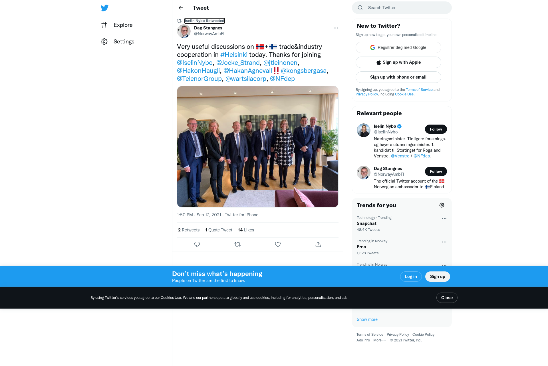 RT @NorwayAmbFI: Very useful discussions on 🇳🇴+🇫🇮 trade&industry cooperation in #Helsinki today. Thanks for joining @IselinNybo, @Jocke_Strand, @jtleinonen, @HakonHaugli, @HakanAgnevall‼️@kongsbergasa, @TelenorGroup, @wartsilacorp, @NFdep https://t.co/2uJLn6T06C