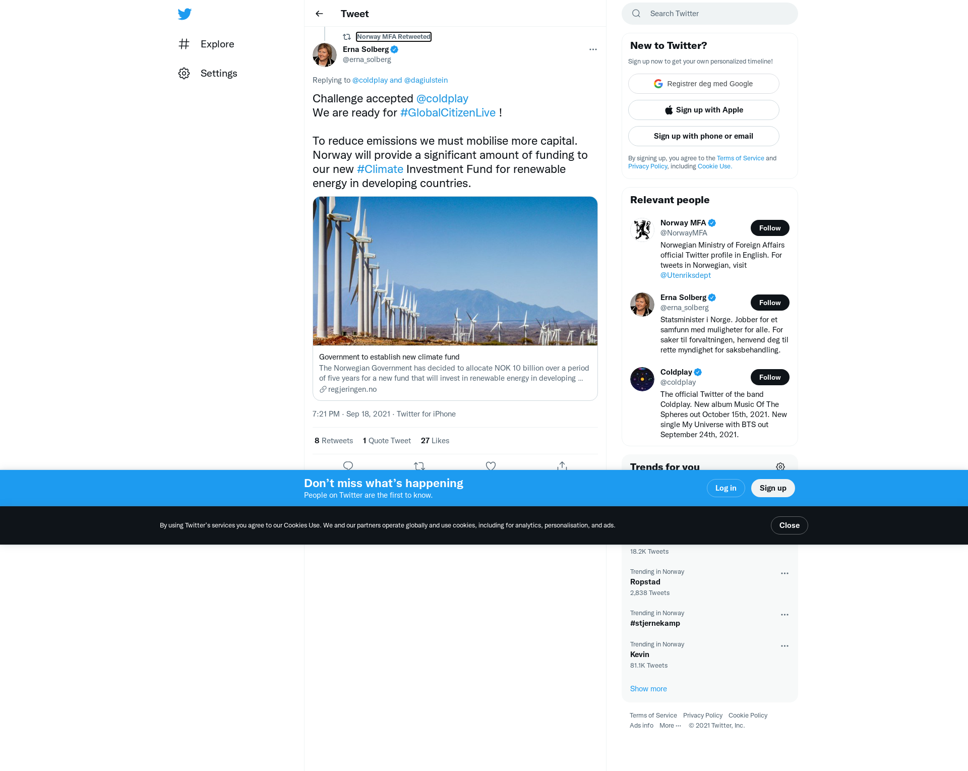 RT @erna_solberg: @coldplay @dagiulstein Challenge accepted @coldplay We are ready for #GlobalCitizenLive ! To reduce emissions we must m…