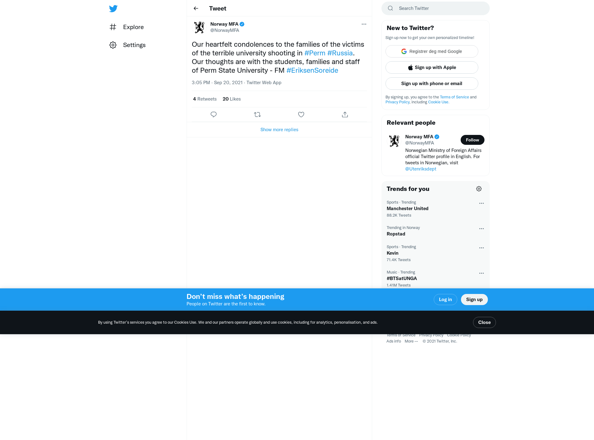 Our heartfelt condolences to the families of the victims of the terrible university shooting in #Perm #Russia. Our thoughts are with the students, families and staff of Perm State University - FM #EriksenSoreide