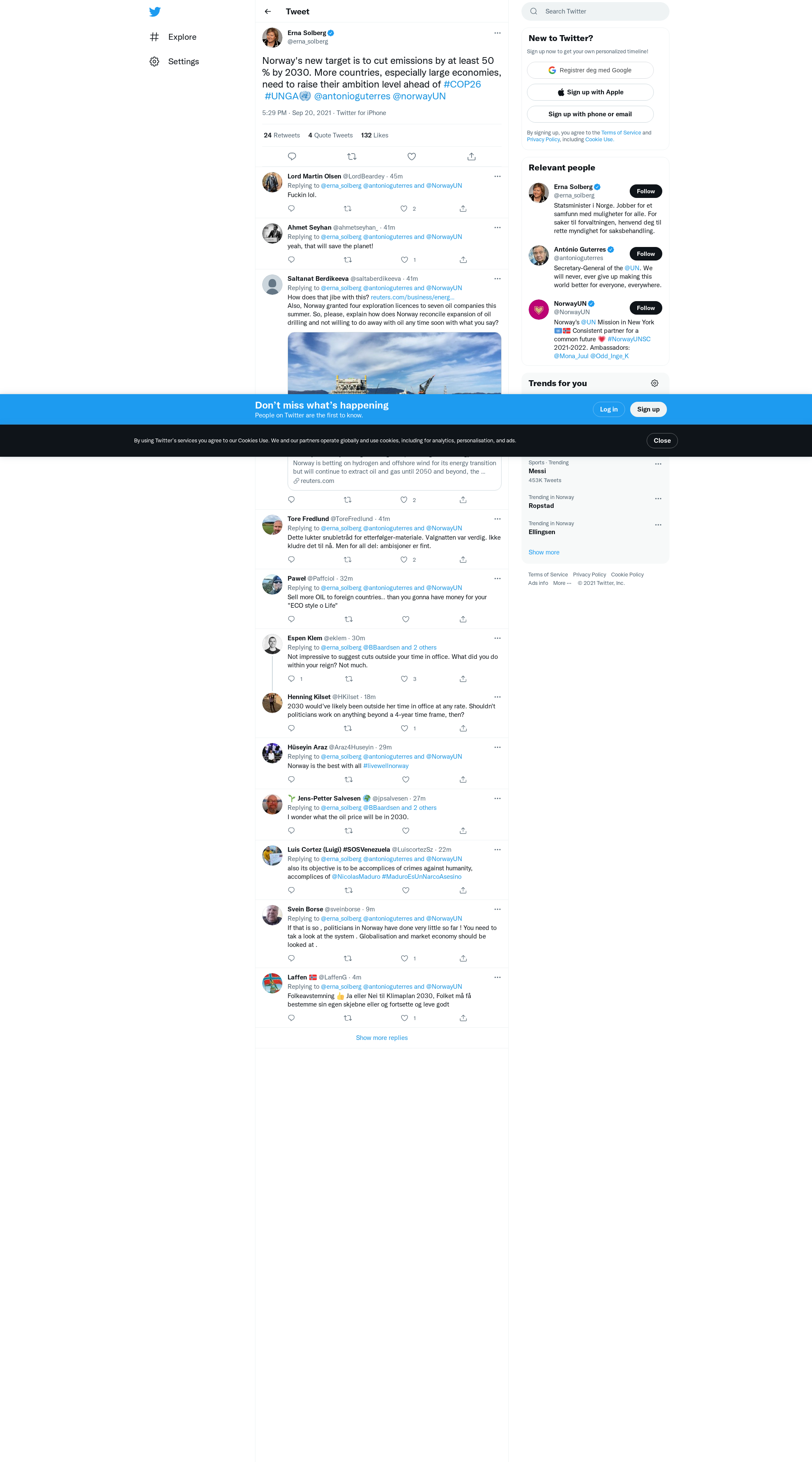 Norway's new target is to cut emissions by at least 50 % by 2030. More countries, especially large economies, need to raise their ambition level ahead of #COP26 #UNGA @antonioguterres @norwayUN