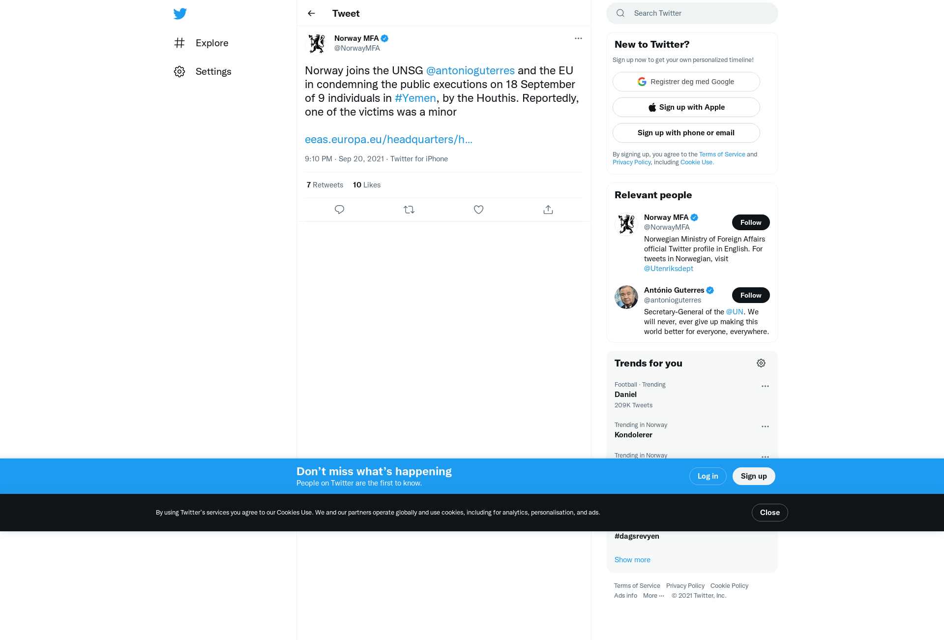 Norway joins the UNSG @antonioguterres and the EU in condemning the public executions on 18 September of 9 individuals in #Yemen, by the Houthis. Reportedly, one of the victims was a minor