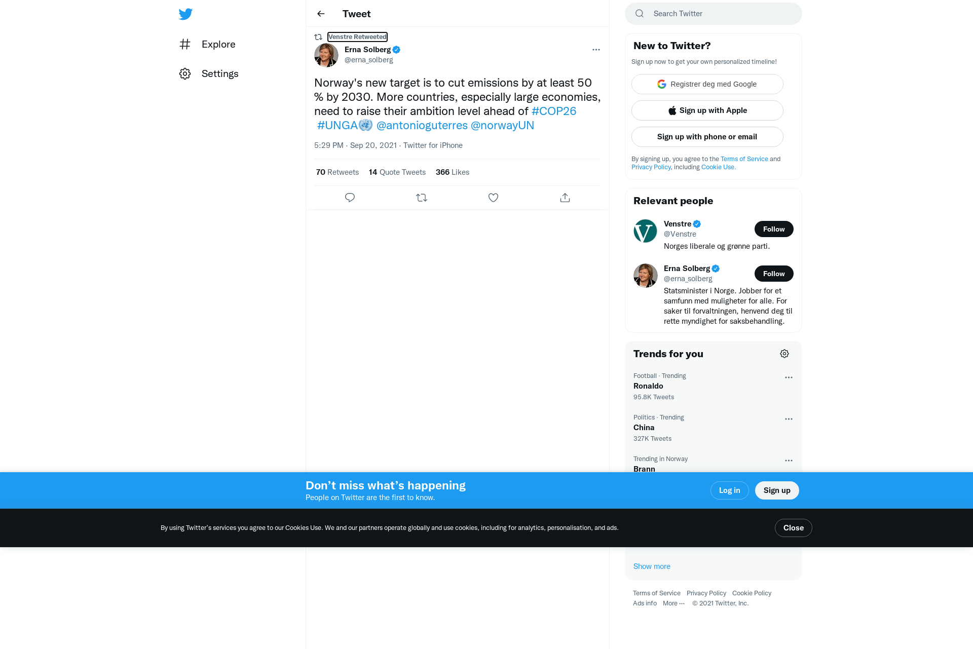RT @erna_solberg: Norway's new target is to cut emissions by at least 50 % by 2030. More countries, especially large economies, need to raise their ambition level ahead of #COP26 #UNGA @antonioguterres @norwayUN