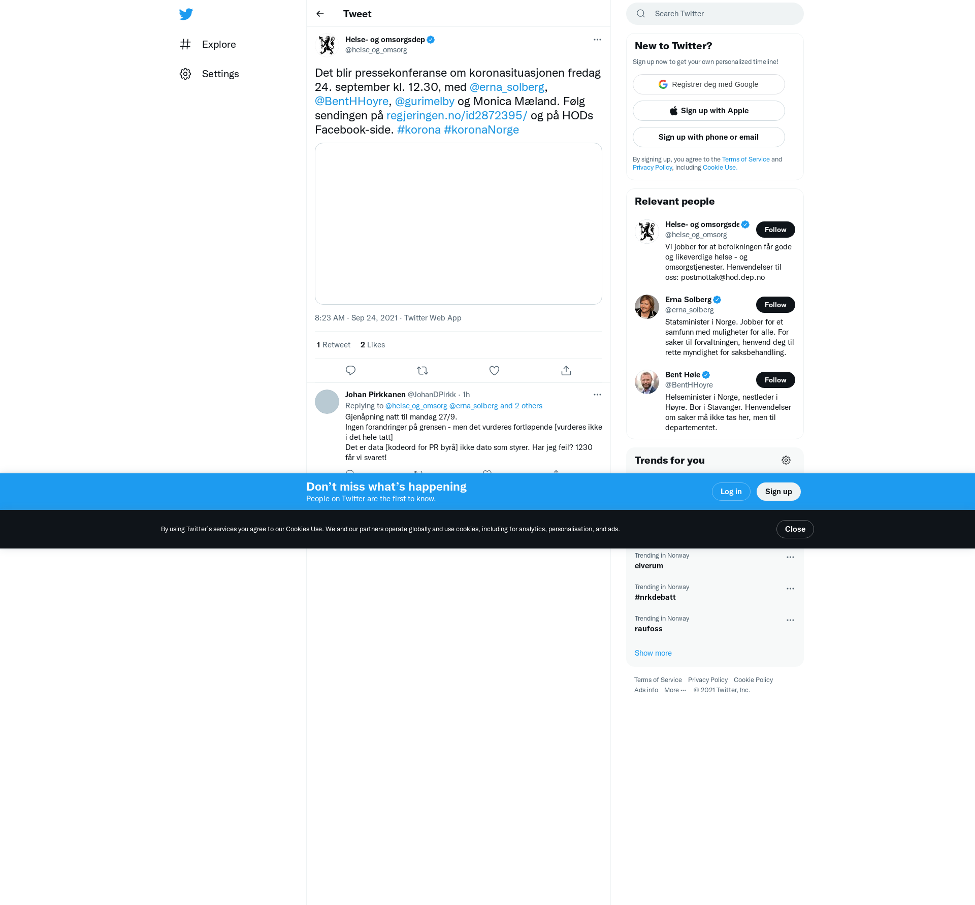 Det blir pressekonferanse om koronasituasjonen fredag 24. september kl. 12.30, med @erna_solberg, @BentHHoyre, @gurimelby og Monica Mæland. Følg sendingen på https://t.co/5o09AFH6nl og på HODs Facebook-side. #korona #koronaNorge https://t.co/OtJzBJlgyn