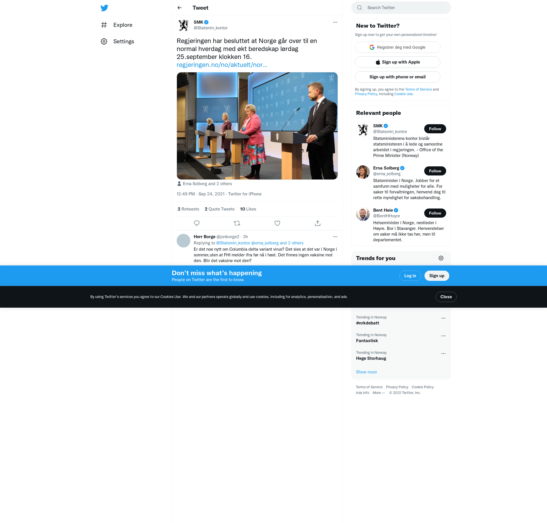 Regjeringen har besluttet at Norge går over til en normal hverdag med økt beredskap lørdag 25.september klokken 16. https://t.co/rGfFJnQ1CW https://t.co/rRAhWnexkx