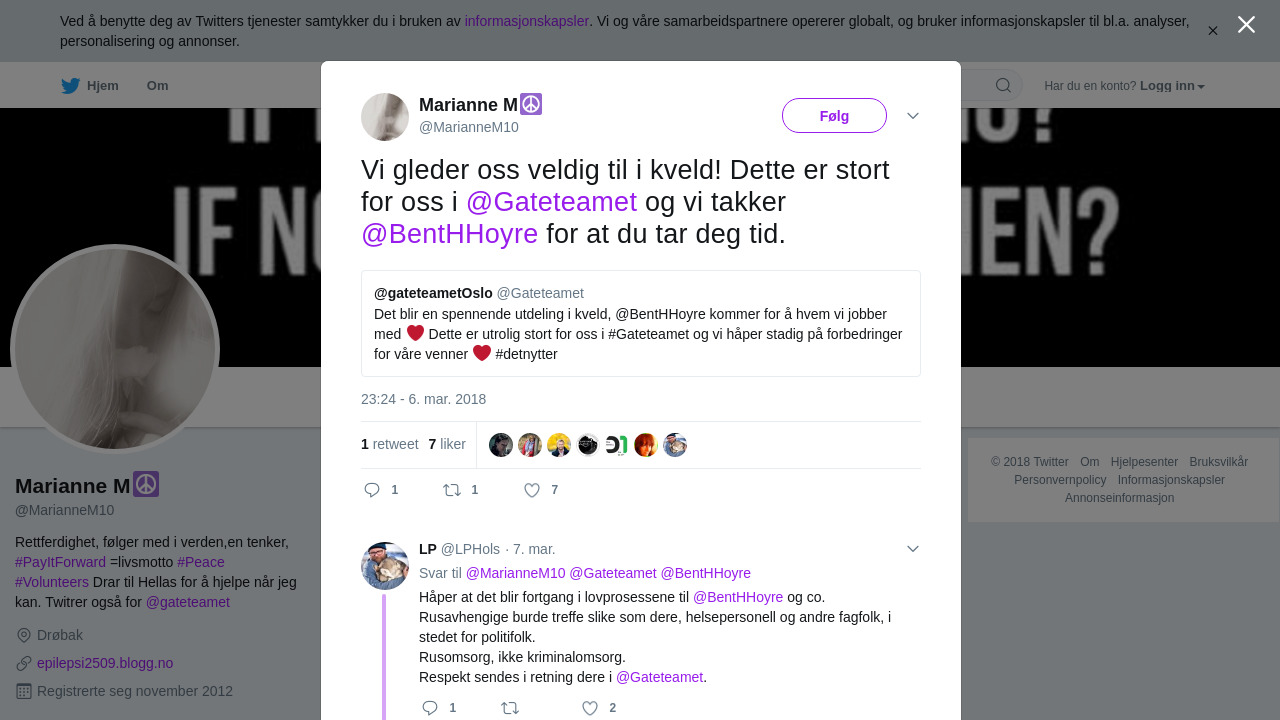 RT @MarianneM10: Vi gleder oss veldig til i kveld! Dette er stort for oss i @Gateteamet og vi takker @BentHHoyre for at du tar deg t… https://t.co/TkIELL9Tnc