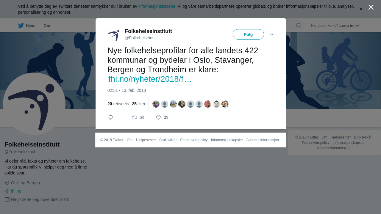 RT @Folkehelseinst: Nye folkehelseprofilar for alle landets 422 kommunar og bydelar i Oslo, Stavanger, Bergen og Trondheim er klare: https://t.co/cjQ0iZsP2F