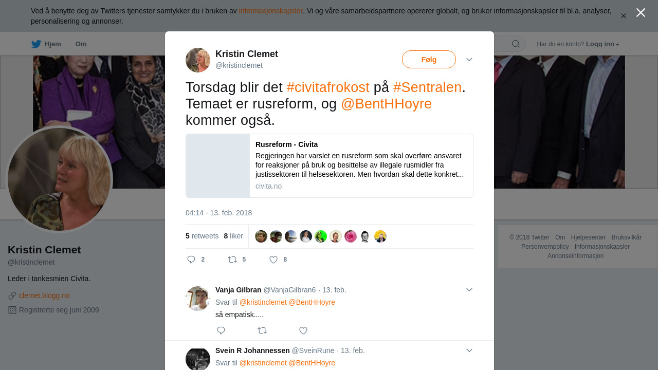 RT @kristinclemet: Torsdag blir det #civitafrokost på #Sentralen. Temaet er rusreform, og @BentHHoyre kommer også. https://t.co/80L8n1gZUr
