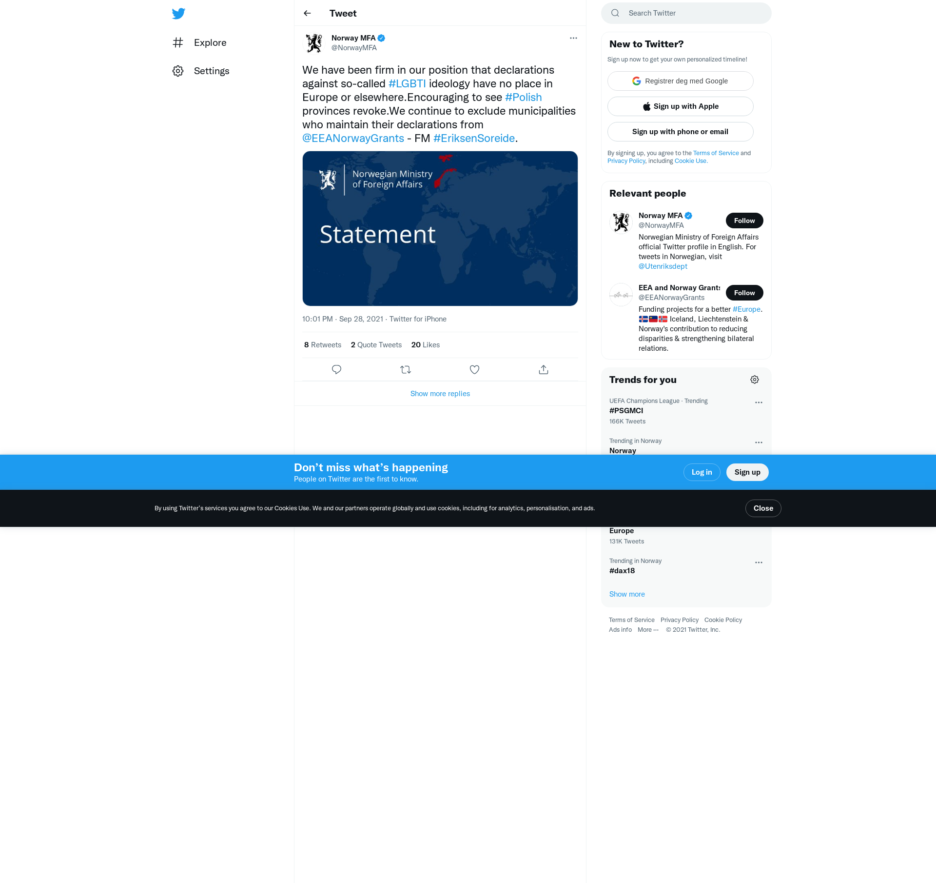 We have been firm in our position that declarations against so-called #LGBTI ideology have no place in Europe or elsewhere.Encouraging to see #Polish provinces revoke.We continue to exclude municipalities who maintain their declarations from @EEANorwayGrants - FM #EriksenSoreide. https://t.co/ODuWOb95rX