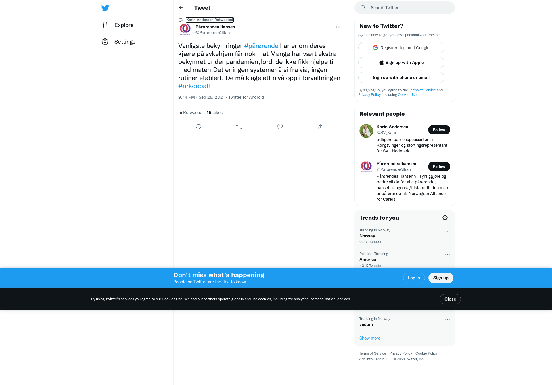 RT @ParorendeAllian: Vanligste bekymringer #pårørende har er om deres kjære på sykehjem får nok mat Mange har vært ekstra bekymret under pandemien,fordi de ikke fikk hjelpe til med maten.Det er ingen systemer å si fra via, ingen rutiner etablert. De må klage ett nivå opp i forvaltningen #nrkdebatt