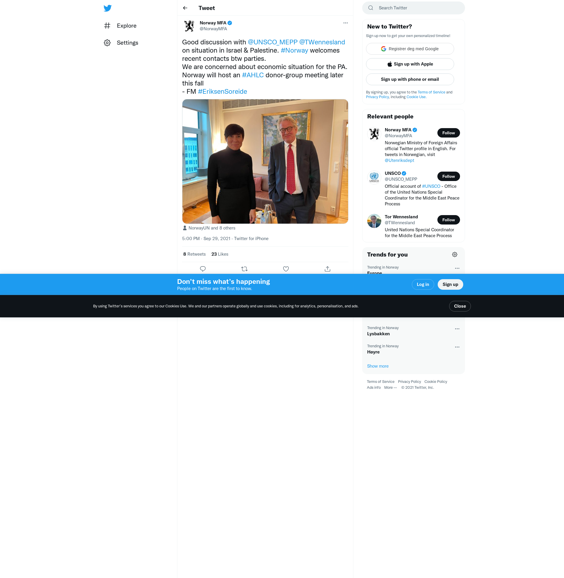 Good discussion with @UNSCO_MEPP @TWennesland on situation in Israel & Palestine. #Norway welcomes recent contacts btw parties.