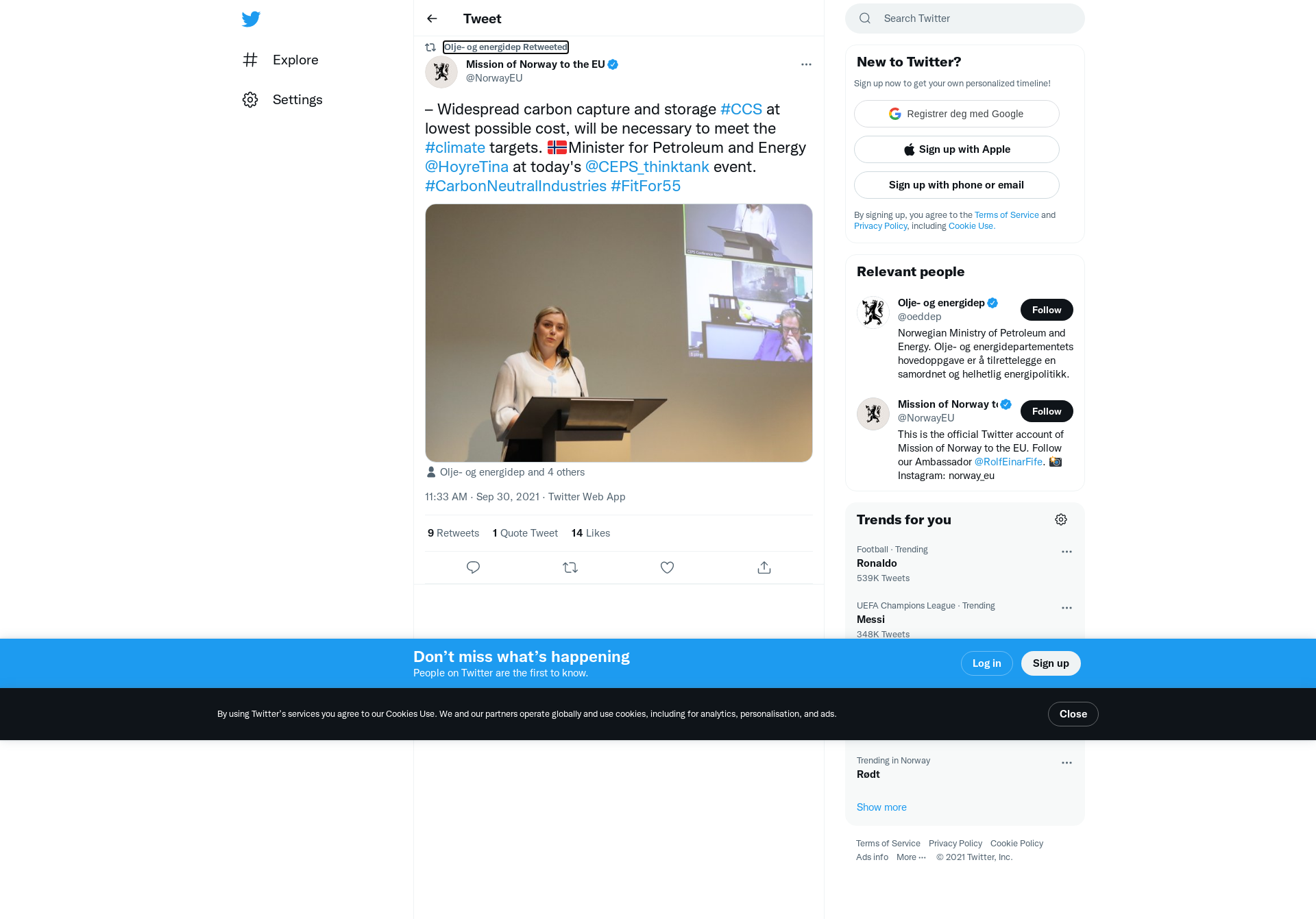 RT @NorwayEU: – Widespread carbon capture and storage #CCS at lowest possible cost, will be necessary to meet the #climate targets. 🇳🇴Minister for Petroleum and Energy @HoyreTina at today's @CEPS_thinktank event.