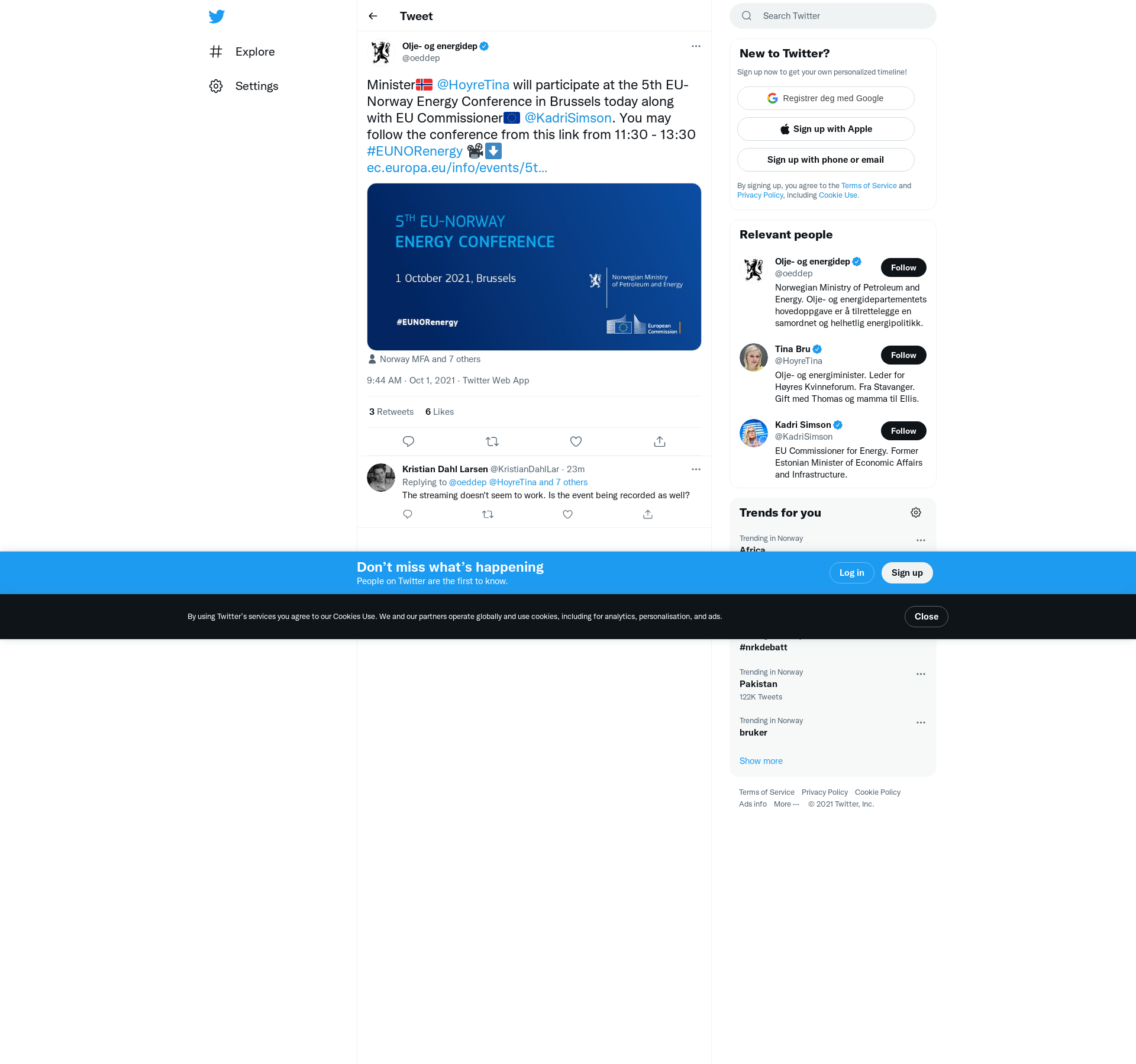 Minister🇳🇴 @HoyreTina will participate at the 5th EU-Norway Energy Conference in Brussels today along with EU Commissioner🇪🇺 @KadriSimson. You may follow the conference from this link from 11:30 - 13:30 #EUNORenergy 📽️⬇️