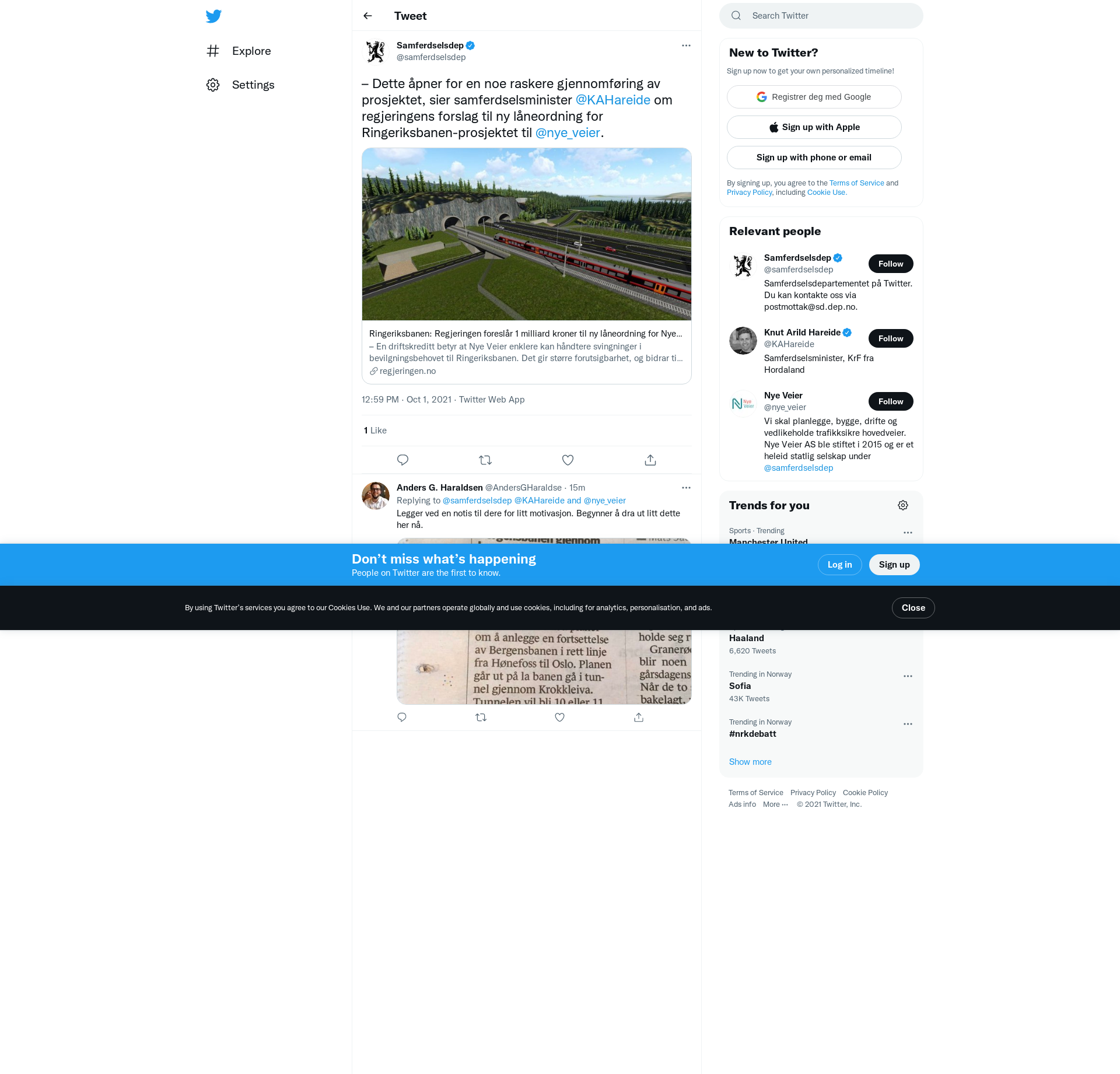 Ringeriksbanen: Regjeringen foreslår 1 milliard kroner til ny låneordning for Nye Veier AS