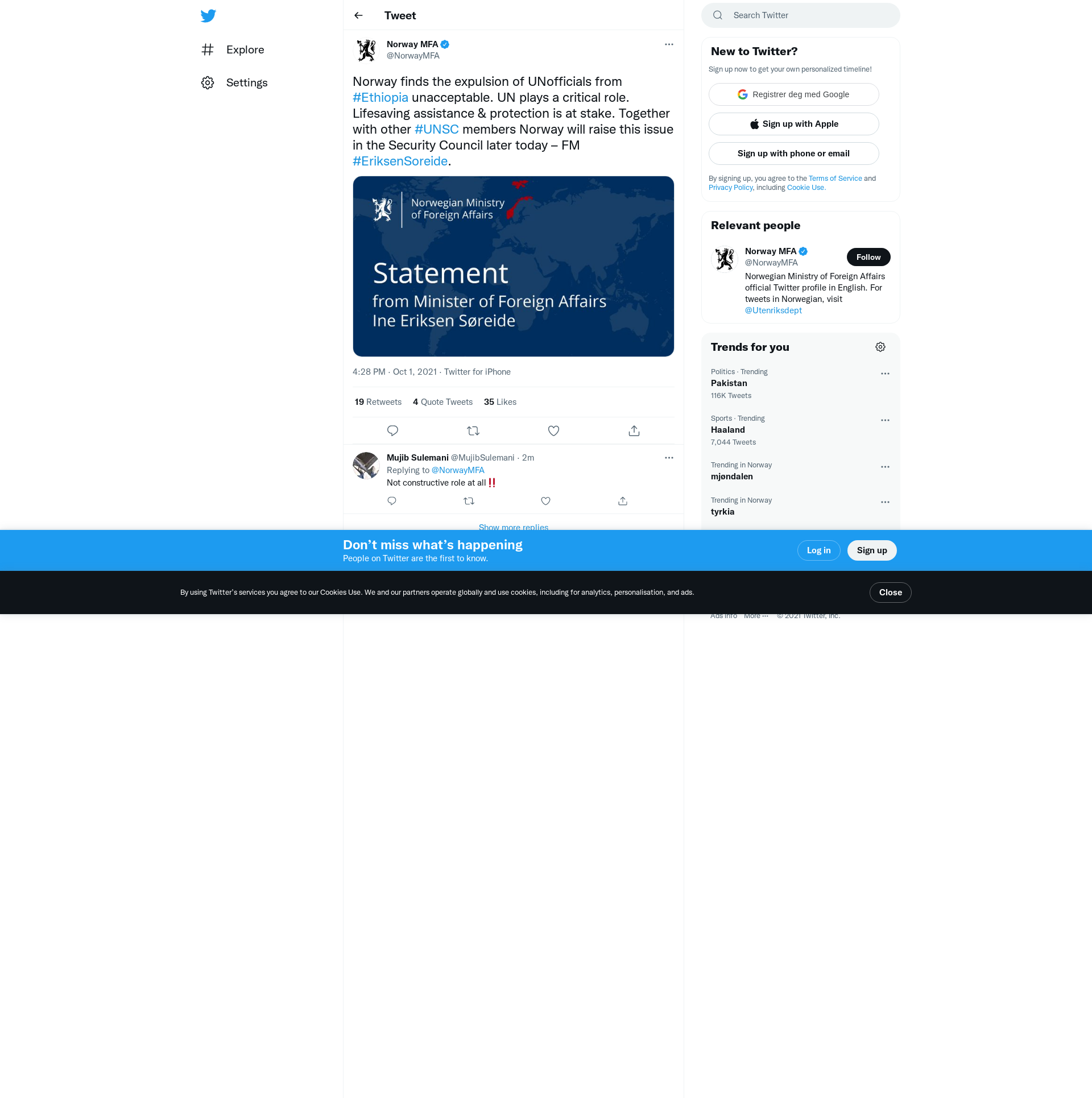 Norway finds the expulsion of UNofficials from #Ethiopia unacceptable. UN plays a critical role. Lifesaving assistance & protection is at stake. Together with other #UNSC members Norway will raise this issue in the Security Council later today – FM #EriksenSoreide. https://t.co/N09dUkHxwx