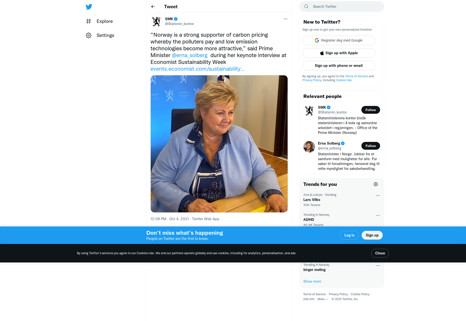 “Norway is a strong supporter of carbon pricing whereby the polluters pay and low emission technologies become more attractive,” said Prime Minister @erna_solberg during her keynote interview at Economist Sustainability Week https://t.co/kEuyBVeHyJ https://t.co/pOFDDdpDkn