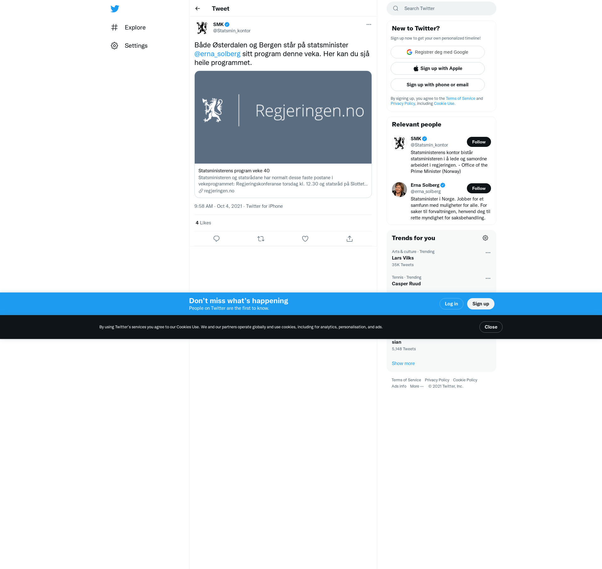 Statsministeren og statsrådane har normalt desse faste postane i vekeprogrammet: Regjeringskonferanse torsdag kl. 12.30 og statsråd på Slottet fredag kl. 11.00. Det er også jamlege møte i Regjeringa sitt sikkerheitsutval (RSU).